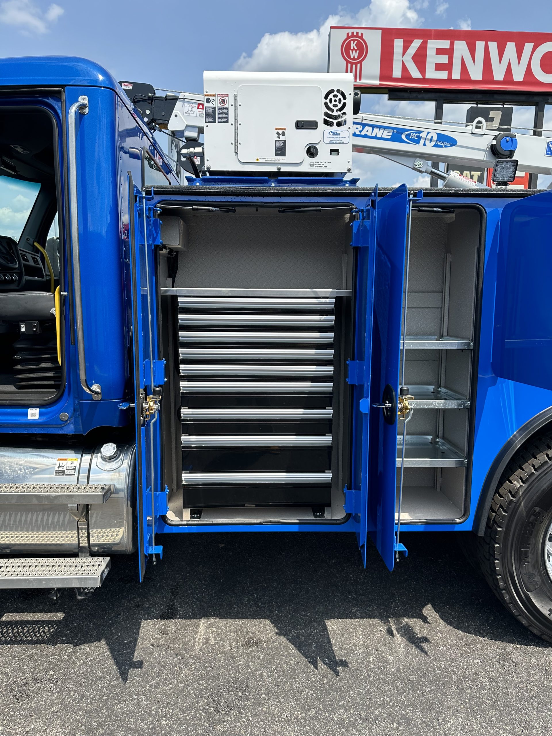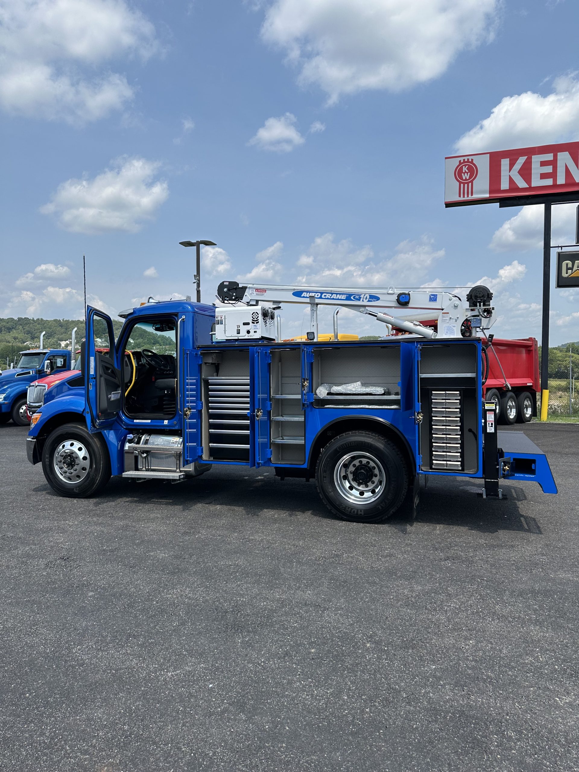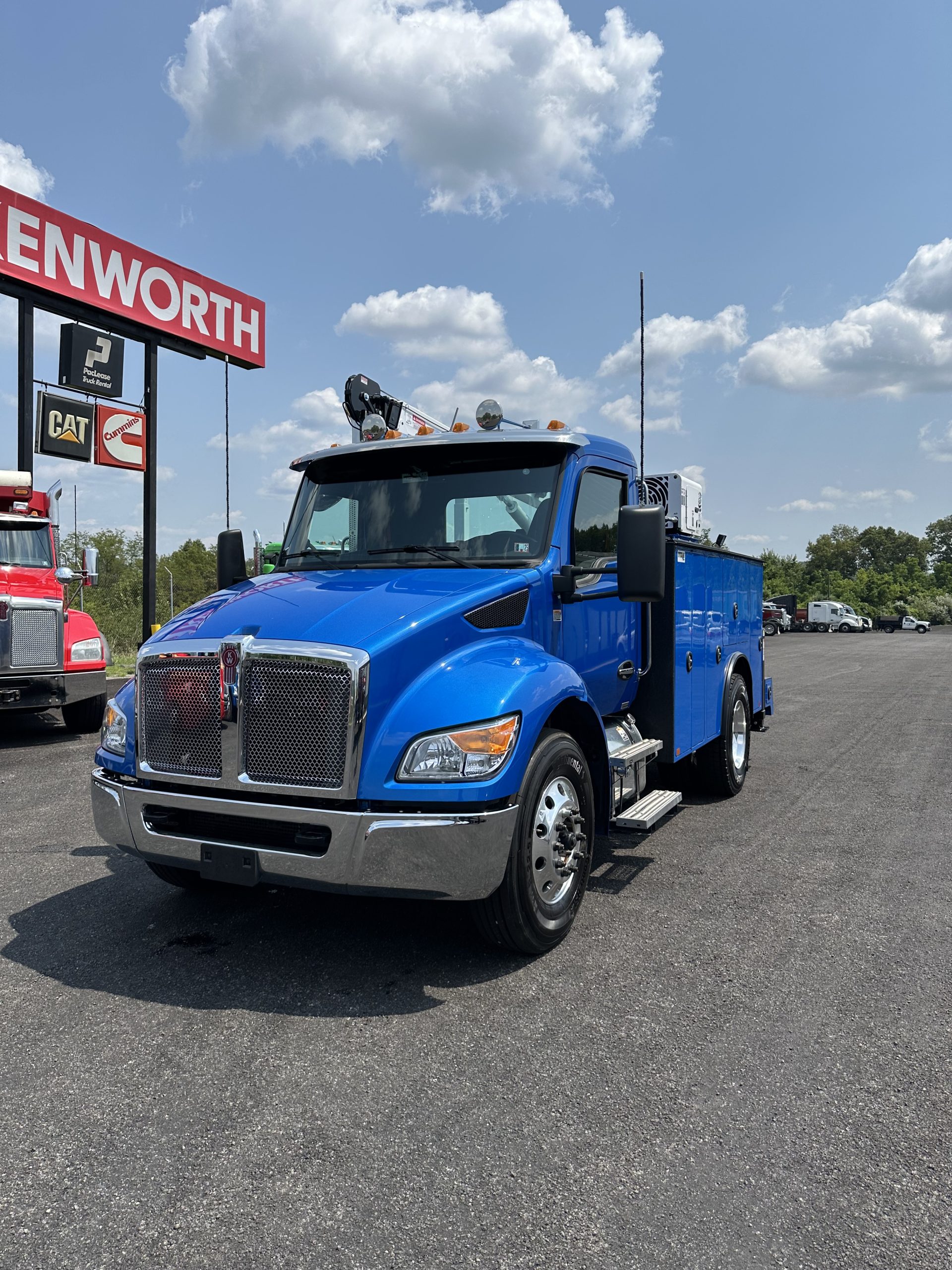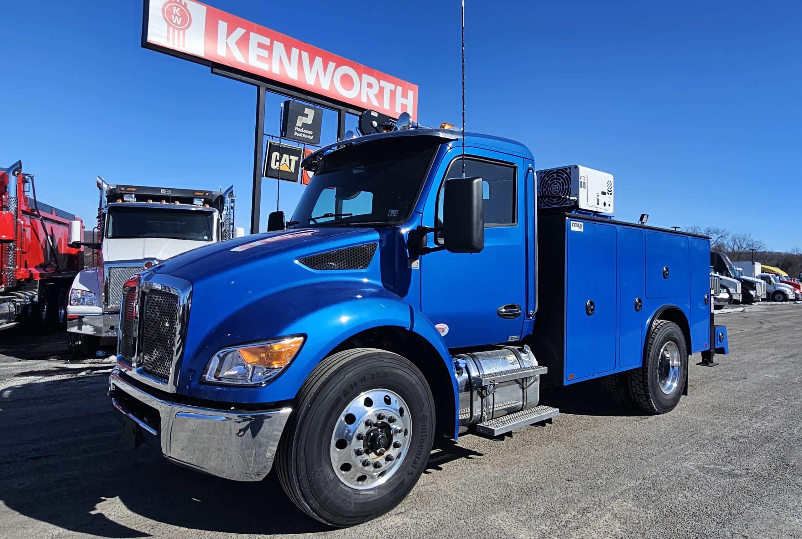 2025 Kenworth T280 Service Truck, PX9 330/1000, Allison 3500 RDS Transmission, Dana locking rear axle, on Hendrickson Air Ride Suspension, Air ride Cab Suspension, (Blue color cab and body), Curry Supply Mechanics Body Titan 60- 11′ per Curry Supply spec sheet.