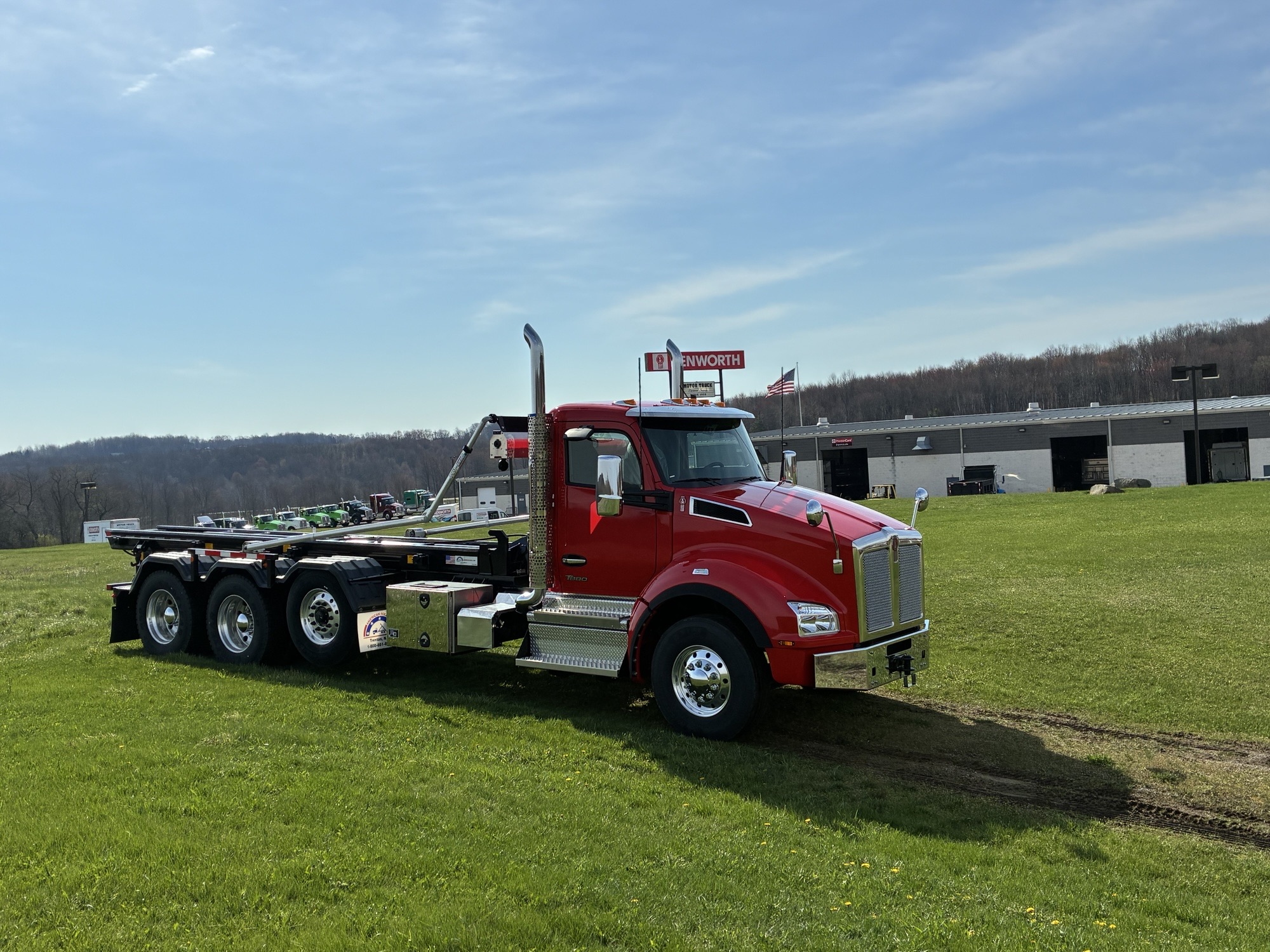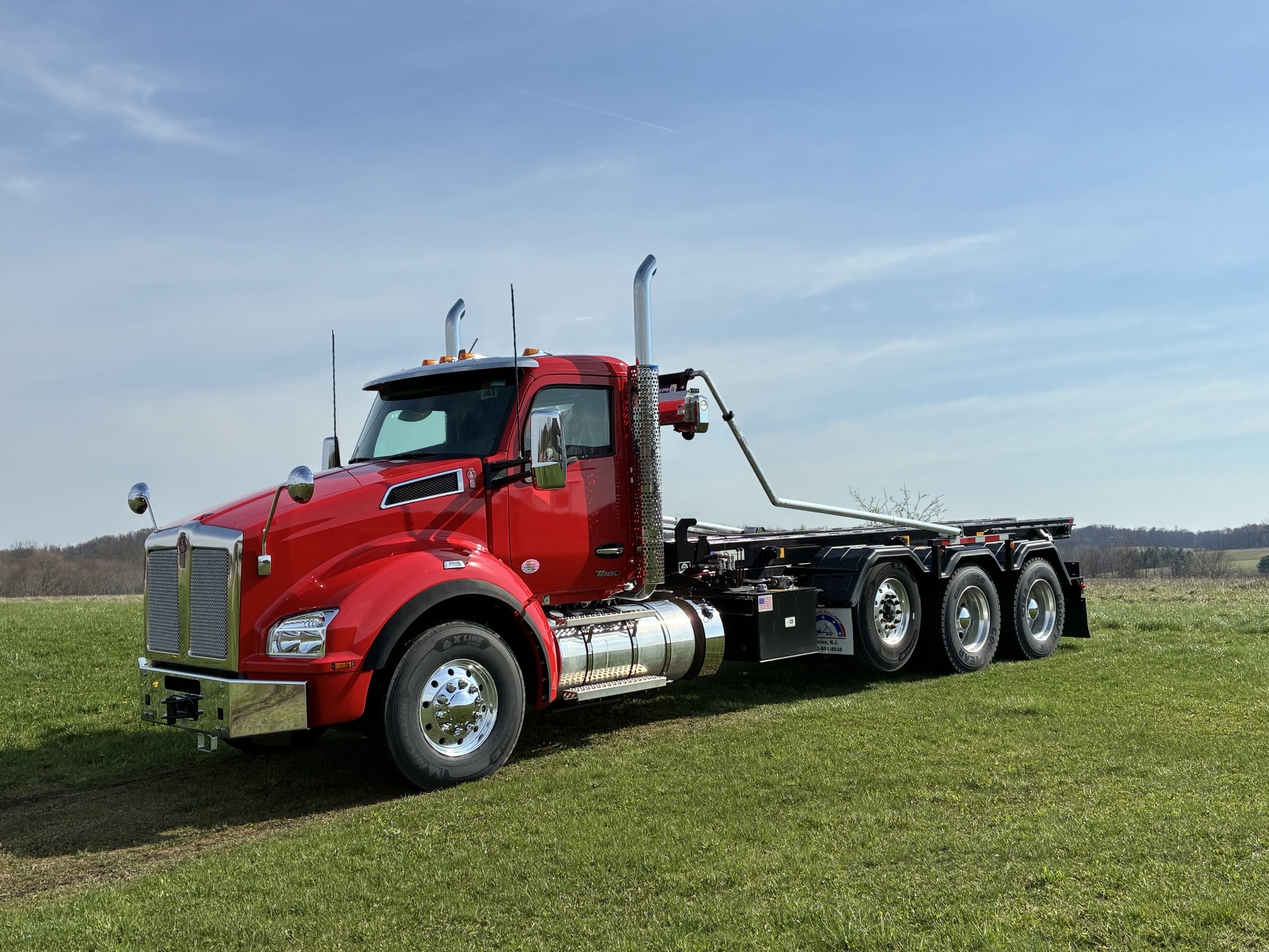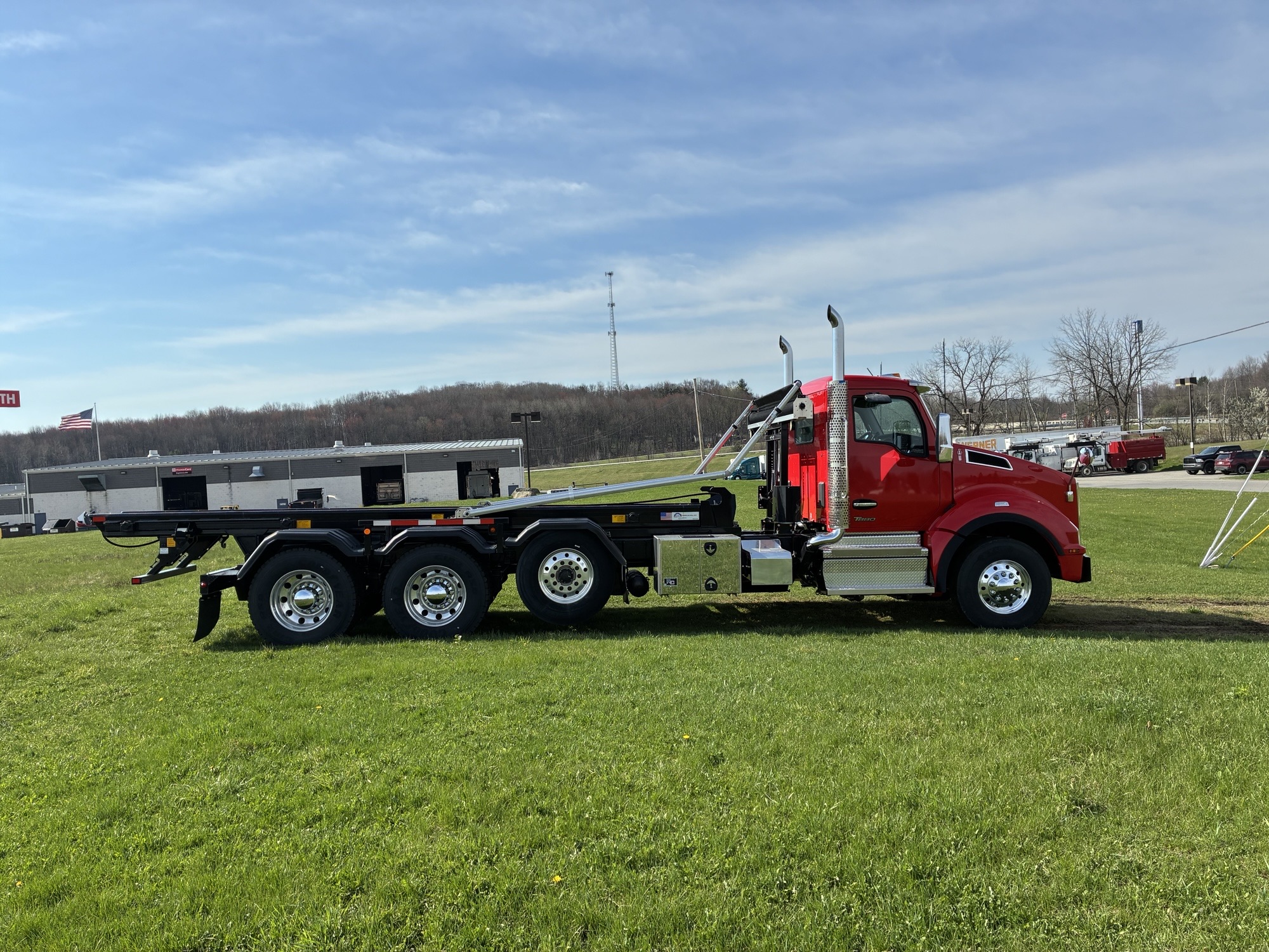 2025 Kenworth T880 Tri Axle Chassis with American ART 75-22 Roll Off Body by Pik Rite, Paccar MX13 510 HP 1850 Torque Engine, Paccar TX18 Automated Transmission, 46K Rears with Dual Locking Differentials, Watson 20K Steerable Pusher Axle, Hendrickson Primaax 46K Air Ride Rear Suspension, 315/80R22.5 Tires on Steer and Pusher, 11R24.5 Tires on Drives, All Alcoa Aluminum Wheels, Chrome Steel Bumper, Stainless Steel Sunvisor, Chrome Kenworth Aero Mirrors, Black Ultra Leather Driver Seat and Black Vinyl Toolbox Rider Seat, Dual Hood Mounted Spot Mirrors, Viper Red Cab with Black Body.