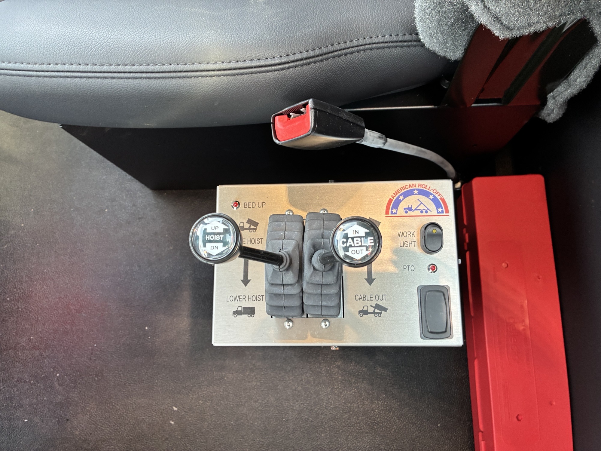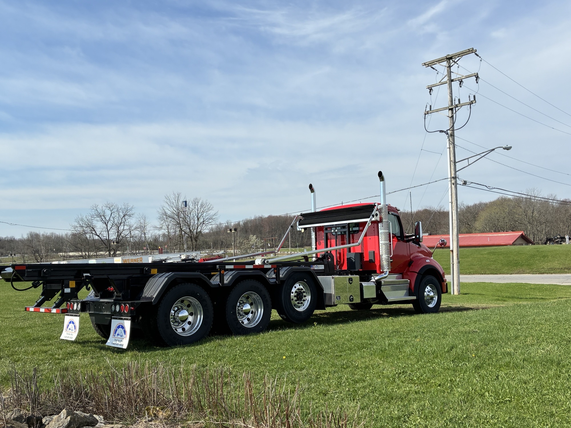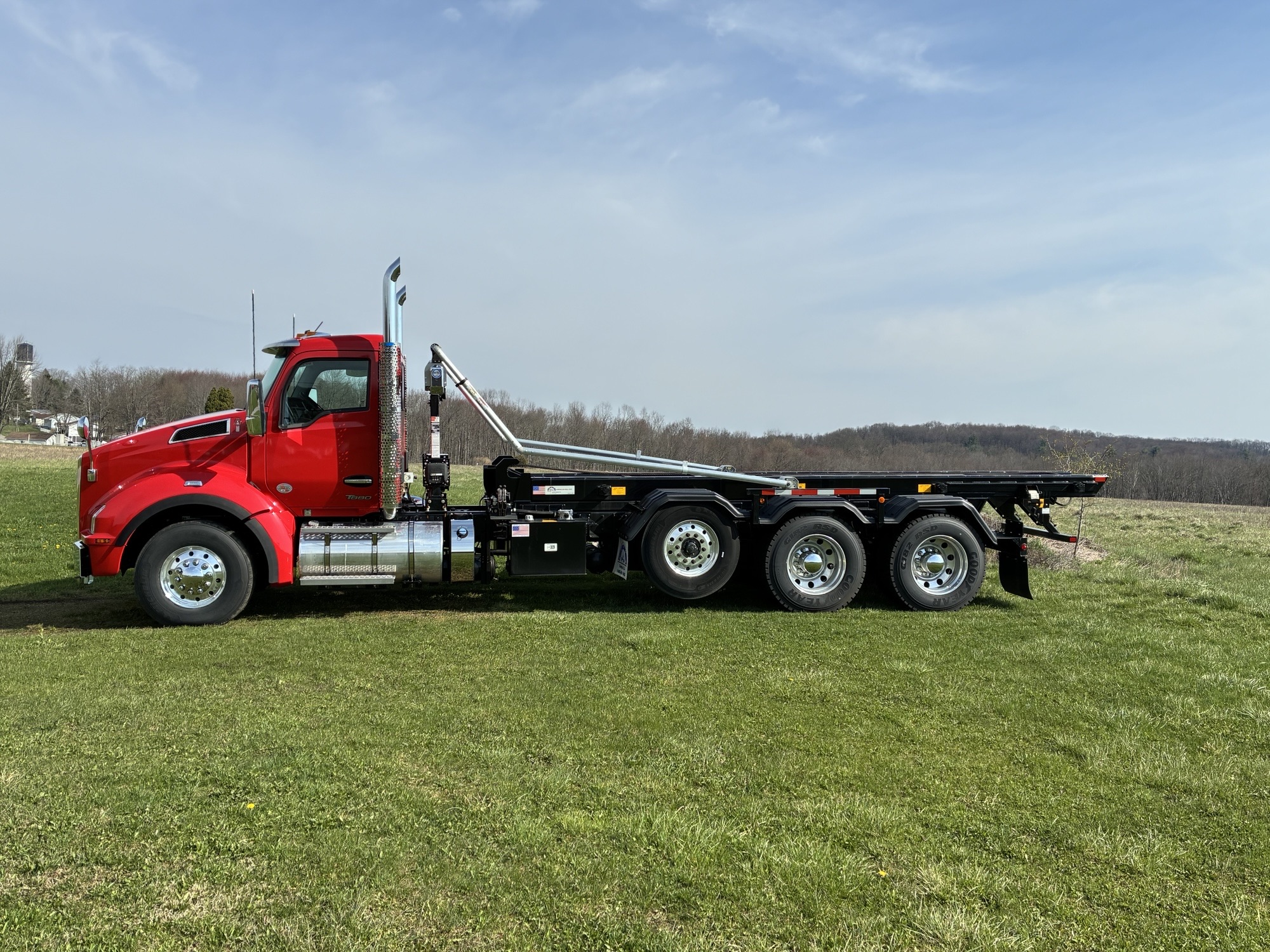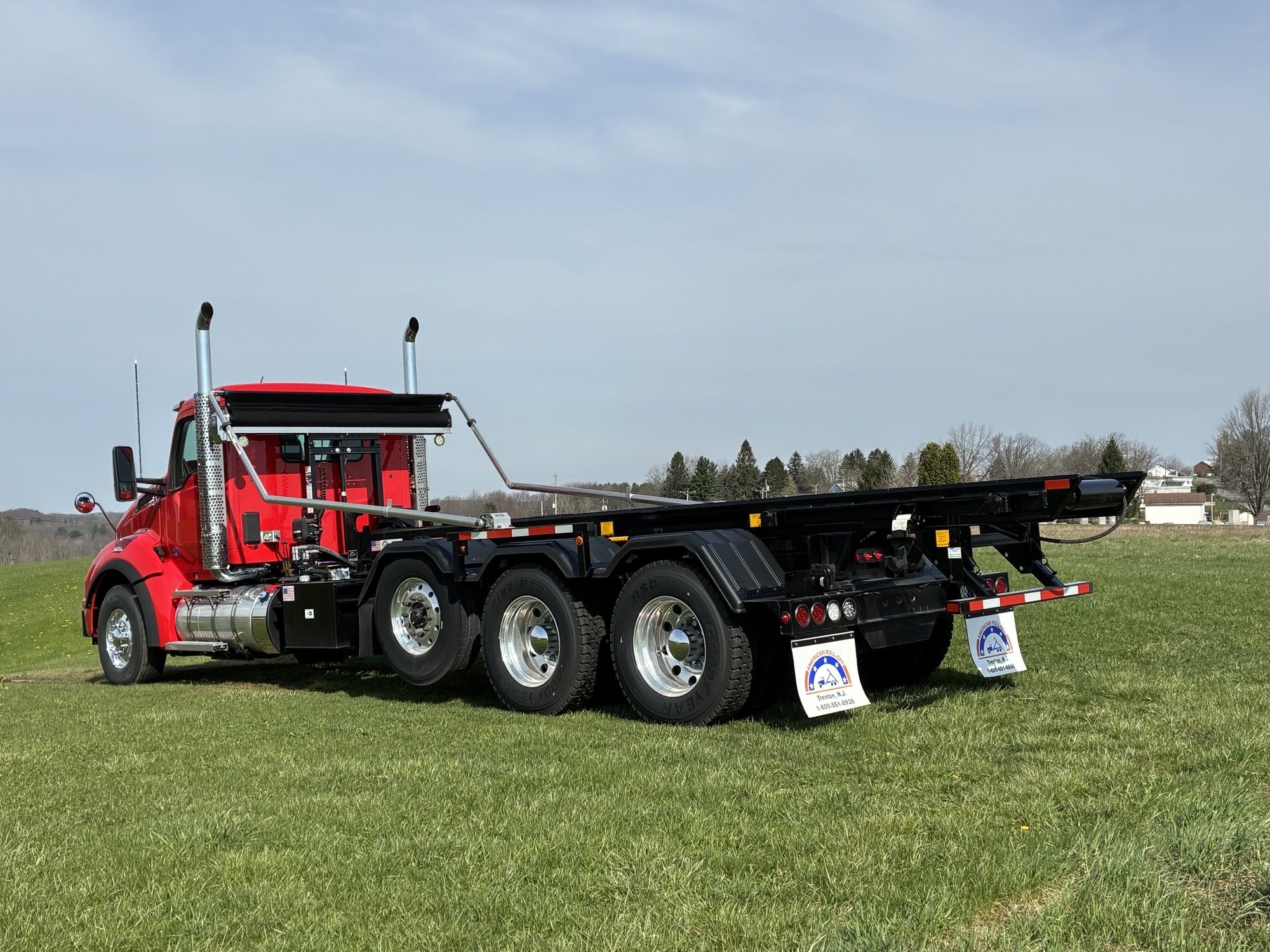 2025 Kenworth T880 Tri Axle Chassis with American ART 75-22 Roll Off Body by Pik Rite, Paccar MX13 510 HP 1850 Torque Engine, Paccar TX18 Automated Transmission, 46K Rears with Dual Locking Differentials, Watson 20K Steerable Pusher Axle, Hendrickson Primaax 46K Air Ride Rear Suspension, 315/80R22.5 Tires on Steer and Pusher, 11R24.5 Tires on Drives, All Alcoa Aluminum Wheels, Chrome Steel Bumper, Stainless Steel Sunvisor, Chrome Kenworth Aero Mirrors, Black Ultra Leather Driver Seat and Black Vinyl Toolbox Rider Seat, Dual Hood Mounted Spot Mirrors, Viper Red Cab with Black Body.