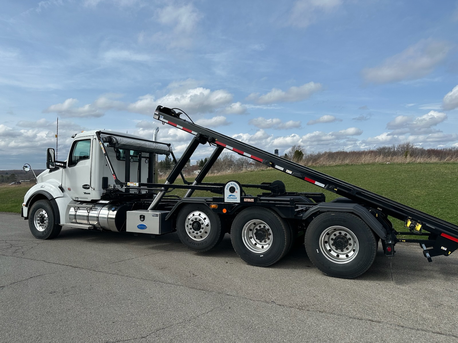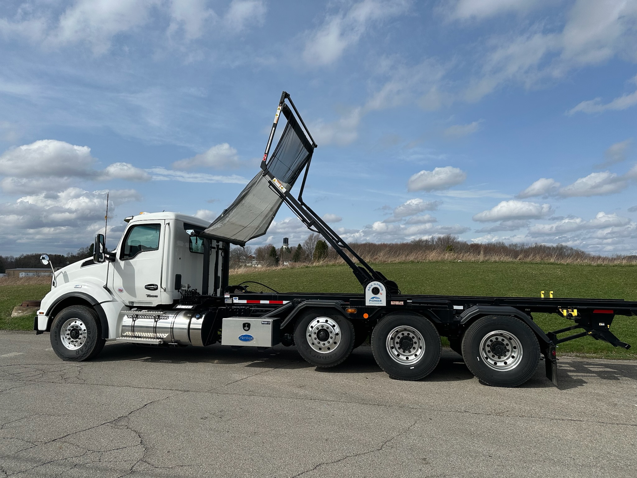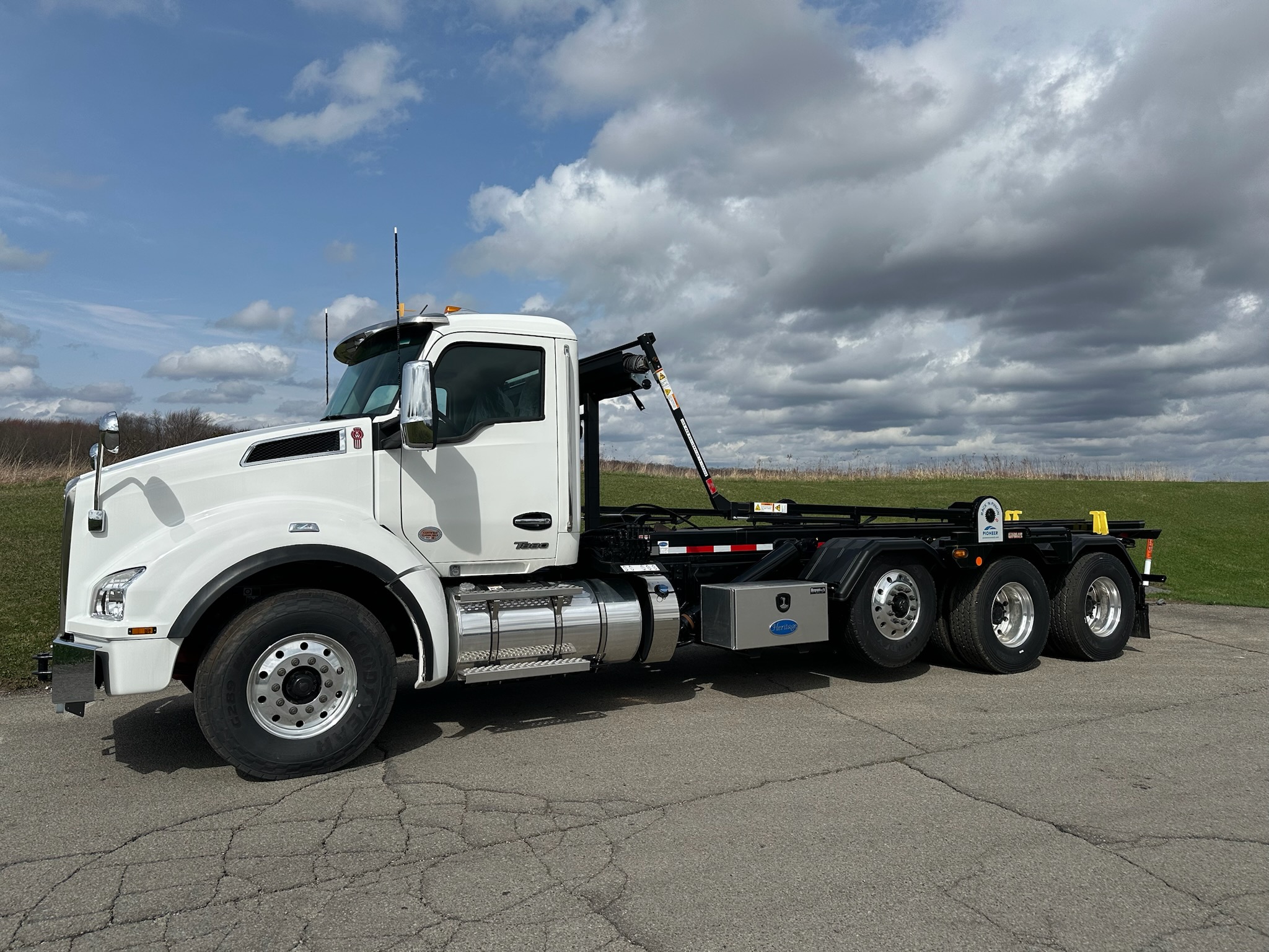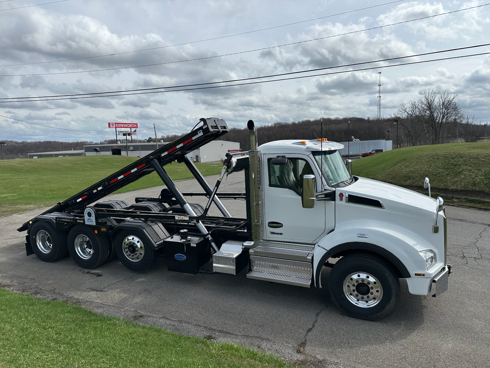 2025 Kenworth T880 Tri Axle Roll Off Chassis with Heritage 75,000 lbs. Roll Off Body, X15 565/1850 Engine, Eaton Endurant XD Pro 18 Speed Automated Transmission, 20K Front and 46K Rear Dual locking Rear Axles, 20K Steerable Pusher Axle, 315 Tires-Front-Pusher & Rears on Alcoa DuraBright Wheels, Black Ultra GT702 Driver Seat and Vinyl Tool Box Rider Seat, White Cab with Black Body.