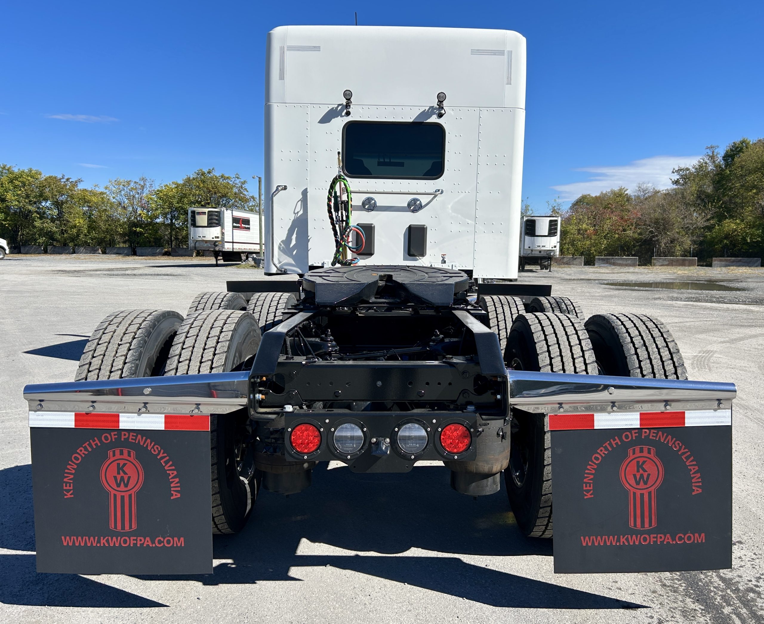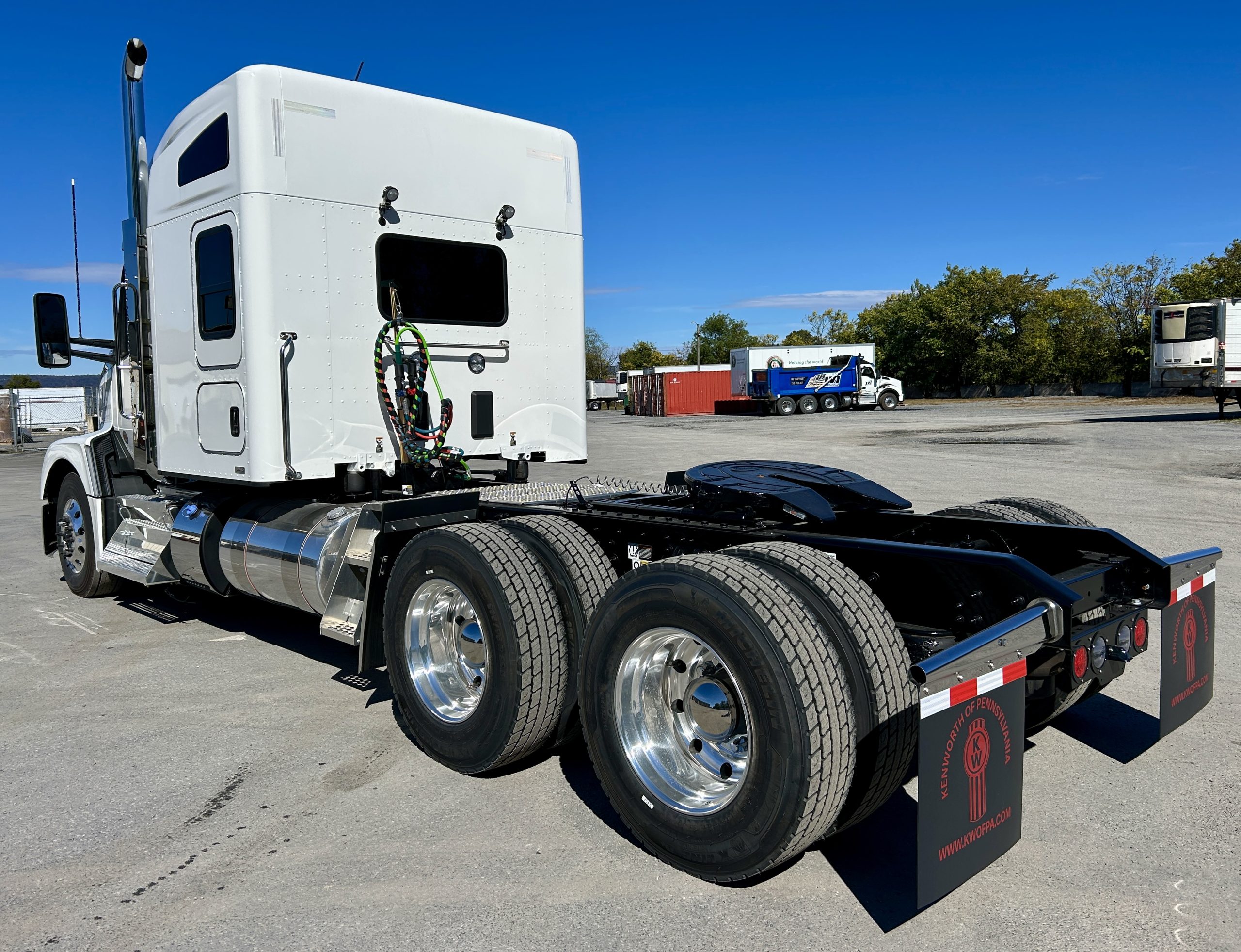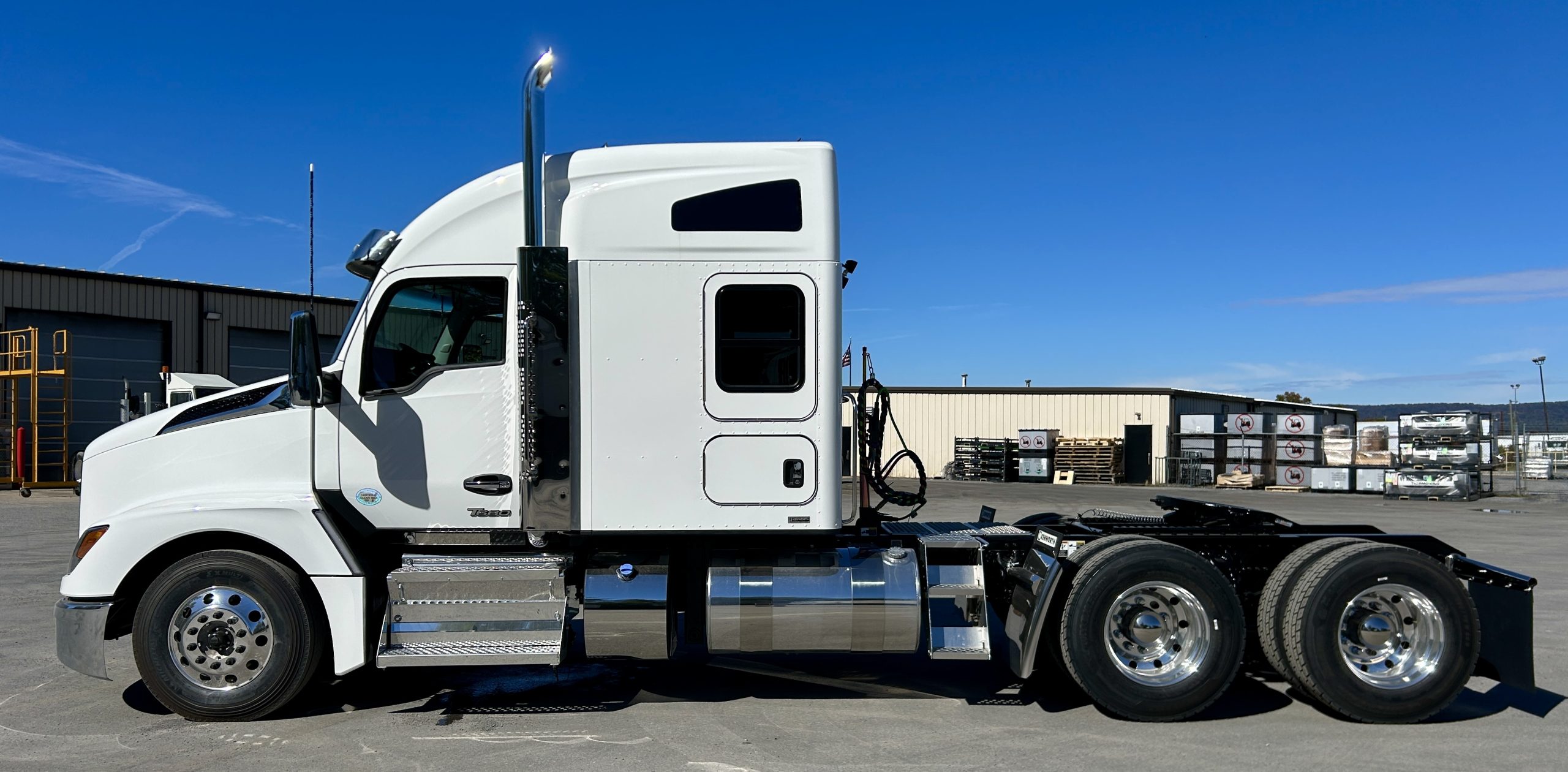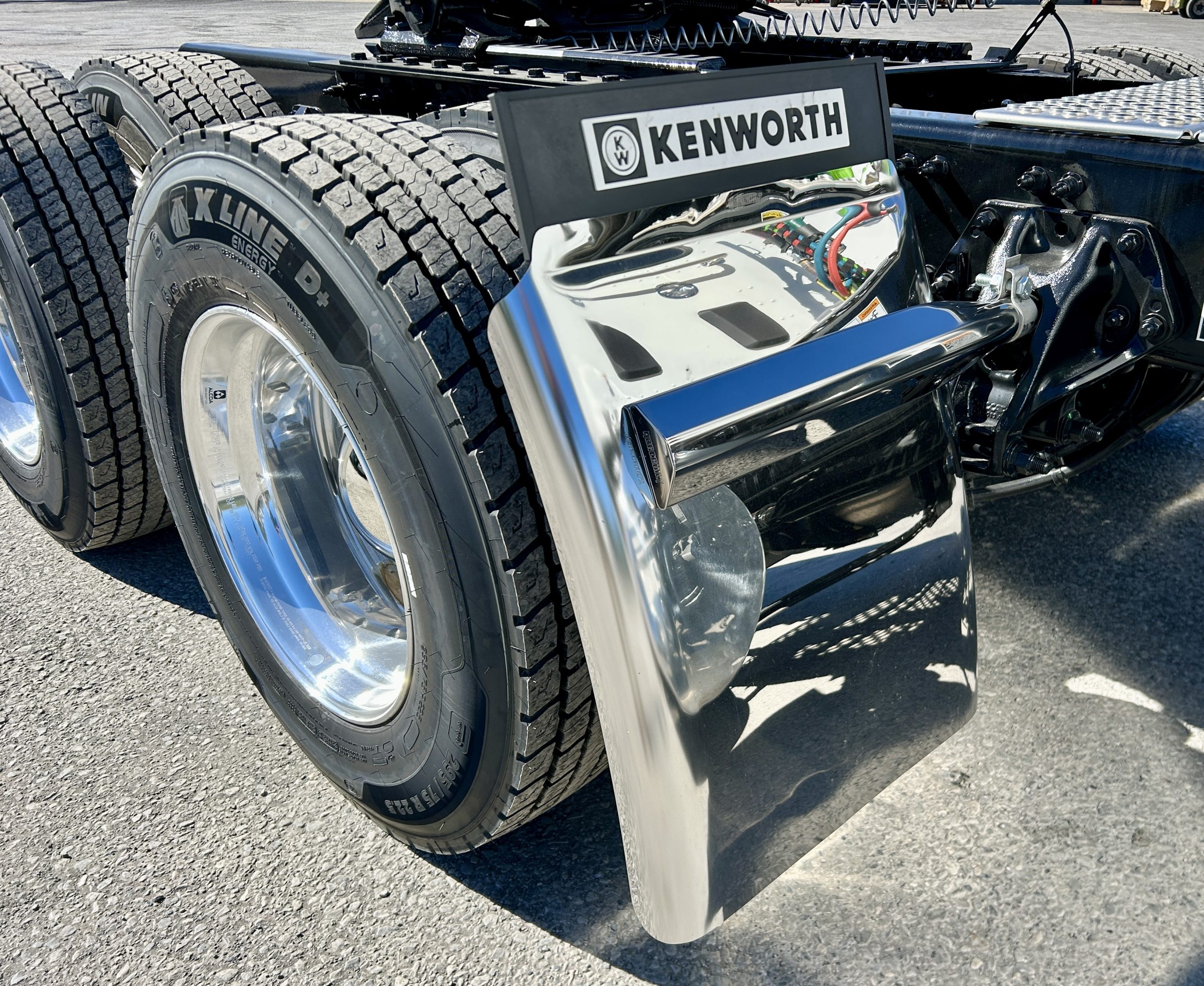 2026 Model Kenworth T680 76″ Mid Roof Sleeper Tractor, Split Fender Hood with exposed steps and tanks, Cummins X15 500HP 1850 Torque Engine, Eaton Endurant 12 Speed Automated Transmission, 12,640# Steer and 40K axle ratings, Axle Lock in Rear Rear Drive Axle, KW AG400L 4 bag rear suspension, Low Profile 22.5 Tires on all Alcoa Aluminum Wheels with Dura-Bright finish on outboard wheels, 100 and 135 Gal Polished Fuel Tanks with Polished 7″ Tank Straps, 30 Gal DEF Tank with Polished SS Cover, Dual Exhaust with Chrome Lower Elbows and 5″X54″ Tail Pipes, Davco 382 Fuel Filter, Slate Gray Diamond Interior with Black Carpet, Gray Heated Air Ride Driver and Rider Seats, Kenworth AM/FM/WB/USB Radio with Header Mounted CB, 1800 Watt Inverter, KW Aero Mirrors with Chrome Shells, LED Headlamp System, L0225 White.