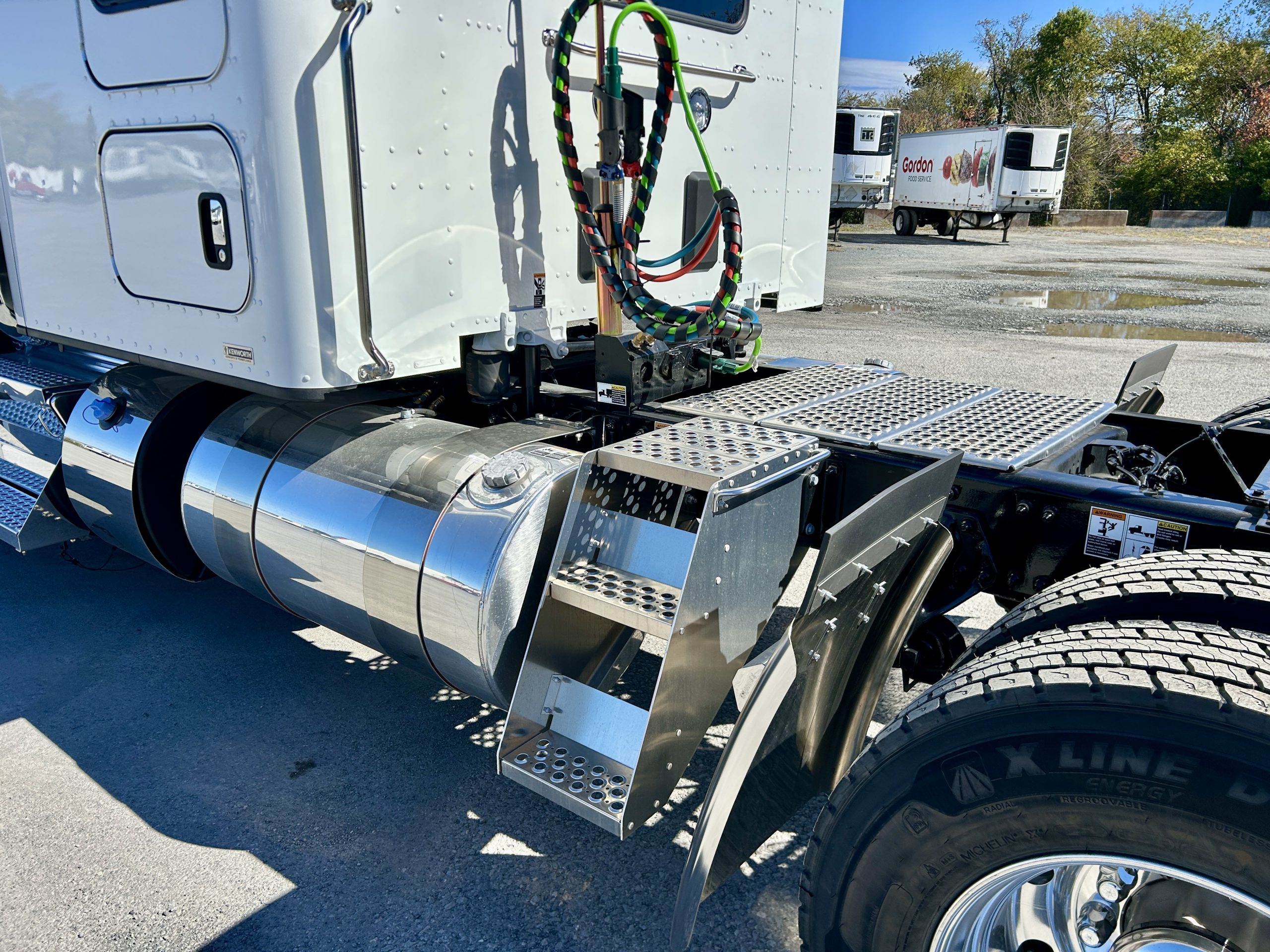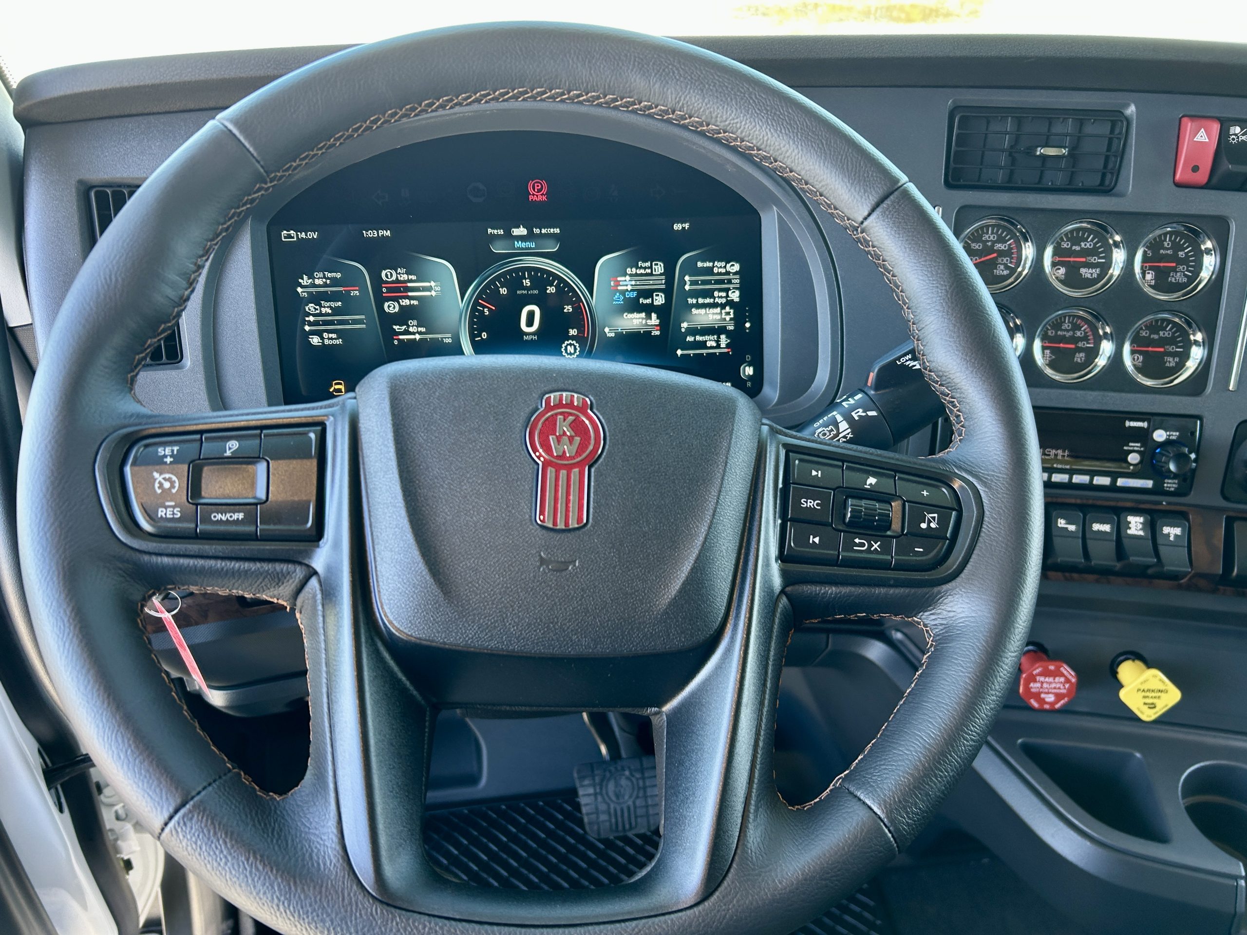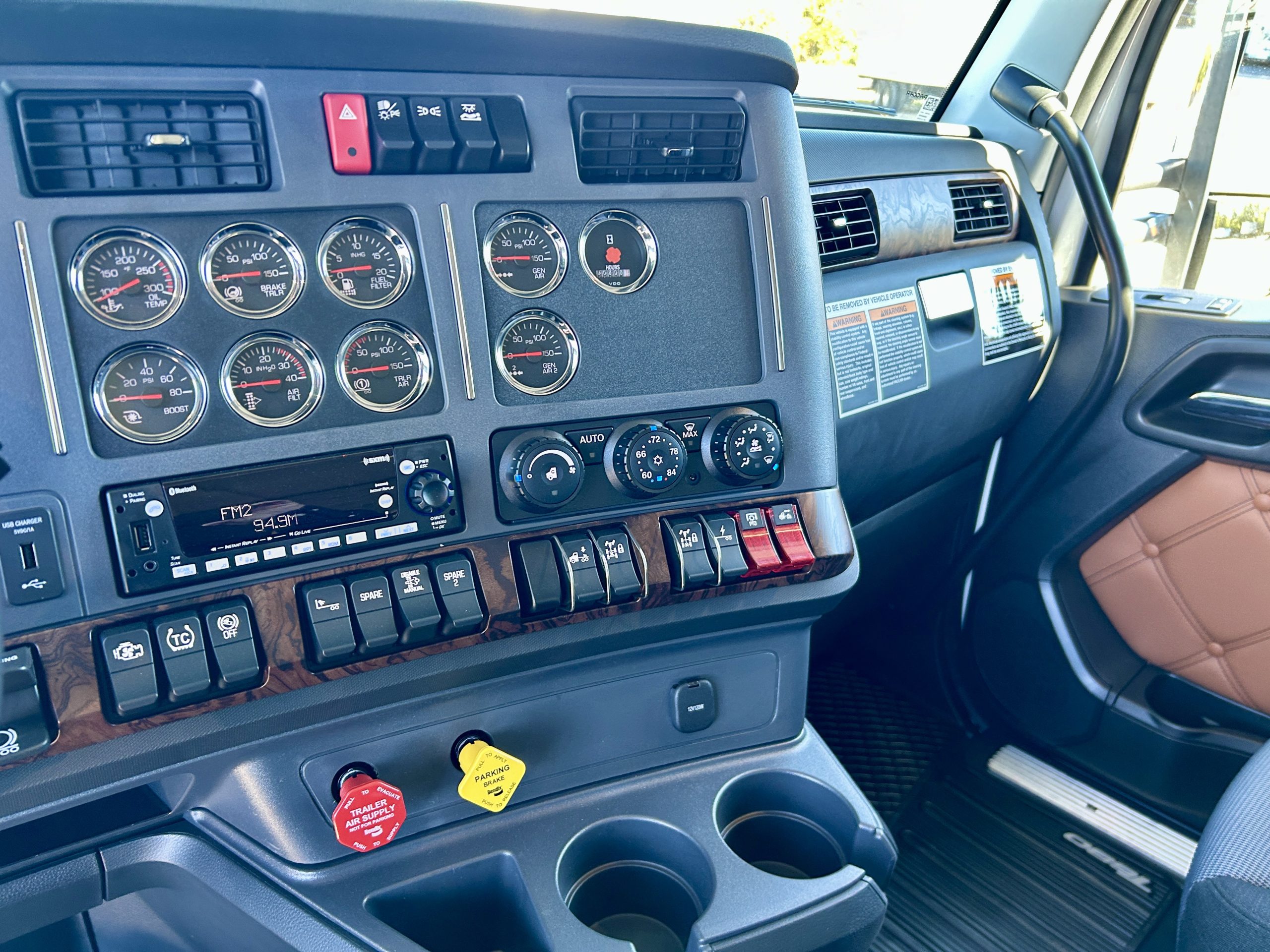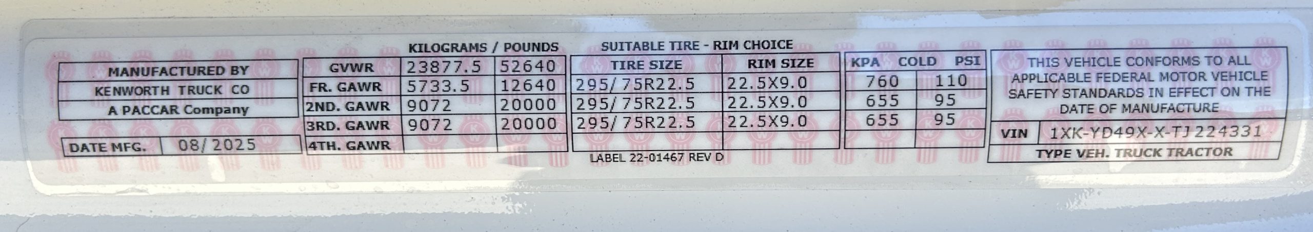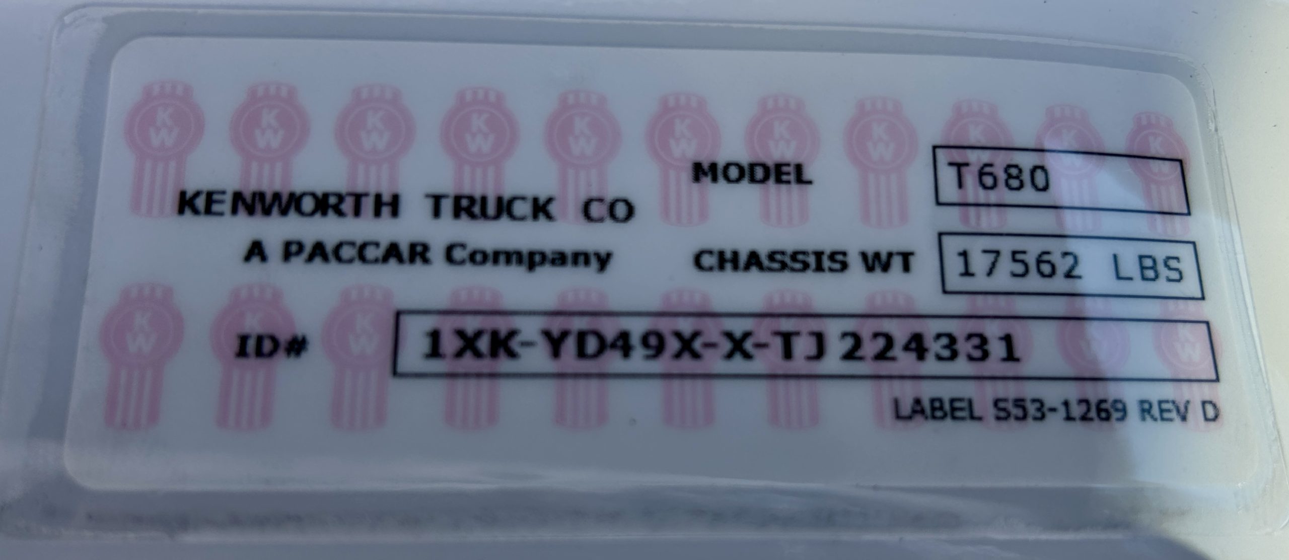 2026 Model Kenworth T680 76″ Mid Roof Sleeper Tractor, Split Fender Hood with exposed steps and tanks, Cummins X15 500HP 1850 Torque Engine, Eaton Endurant 12 Speed Automated Transmission, 12,640# Steer and 40K axle ratings, Axle Lock in Rear Rear Drive Axle, KW AG400L 4 bag rear suspension, Low Profile 22.5 Tires on all Alcoa Aluminum Wheels with Dura-Bright finish on outboard wheels, 100 and 135 Gal Polished Fuel Tanks with Polished 7″ Tank Straps, 30 Gal DEF Tank with Polished SS Cover, Dual Exhaust with Chrome Lower Elbows and 5″X54″ Tail Pipes, Davco 382 Fuel Filter, Slate Gray Diamond Interior with Black Carpet, Gray Heated Air Ride Driver and Rider Seats, Kenworth AM/FM/WB/USB Radio with Header Mounted CB, 1800 Watt Inverter, KW Aero Mirrors with Chrome Shells, LED Headlamp System, L0225 White.