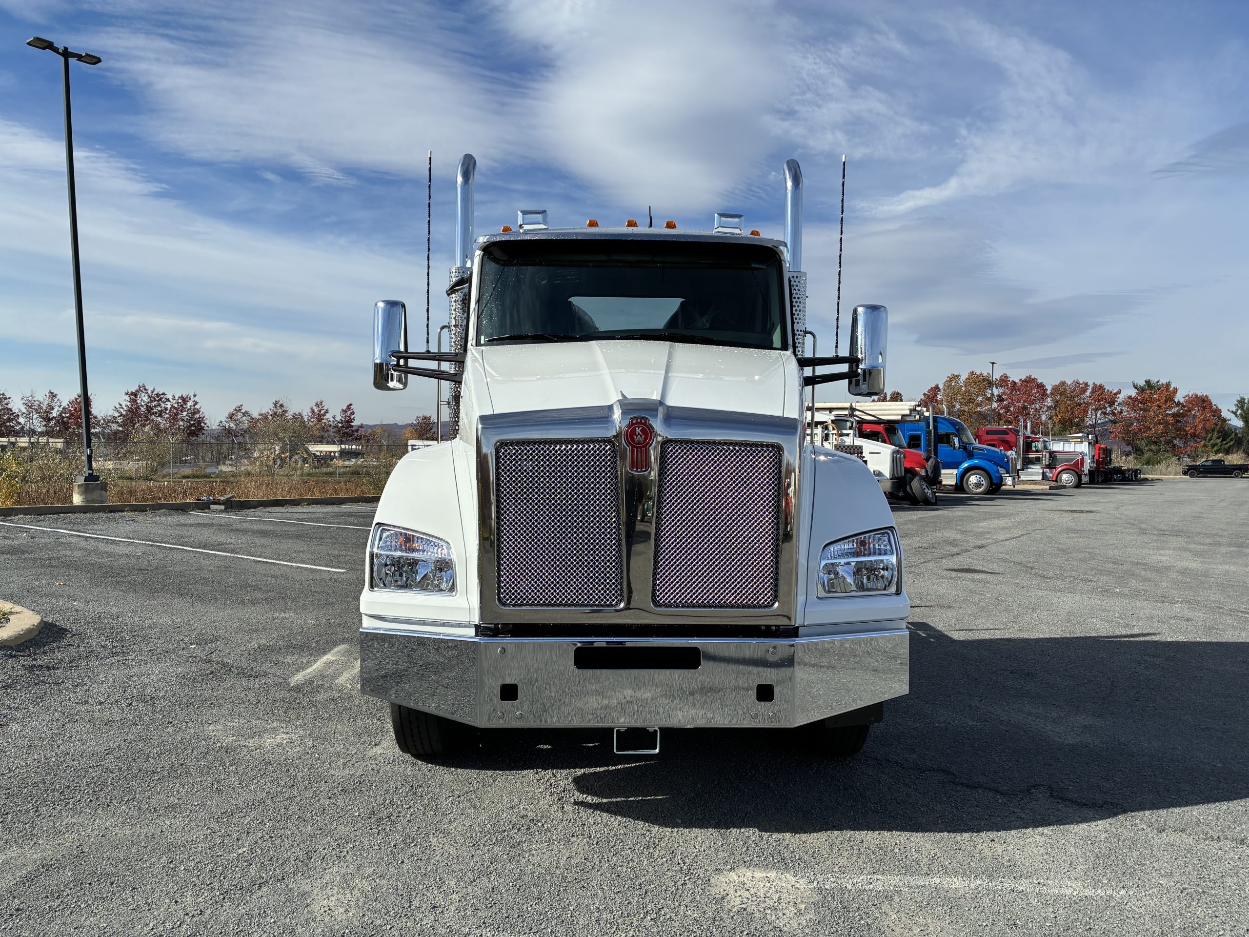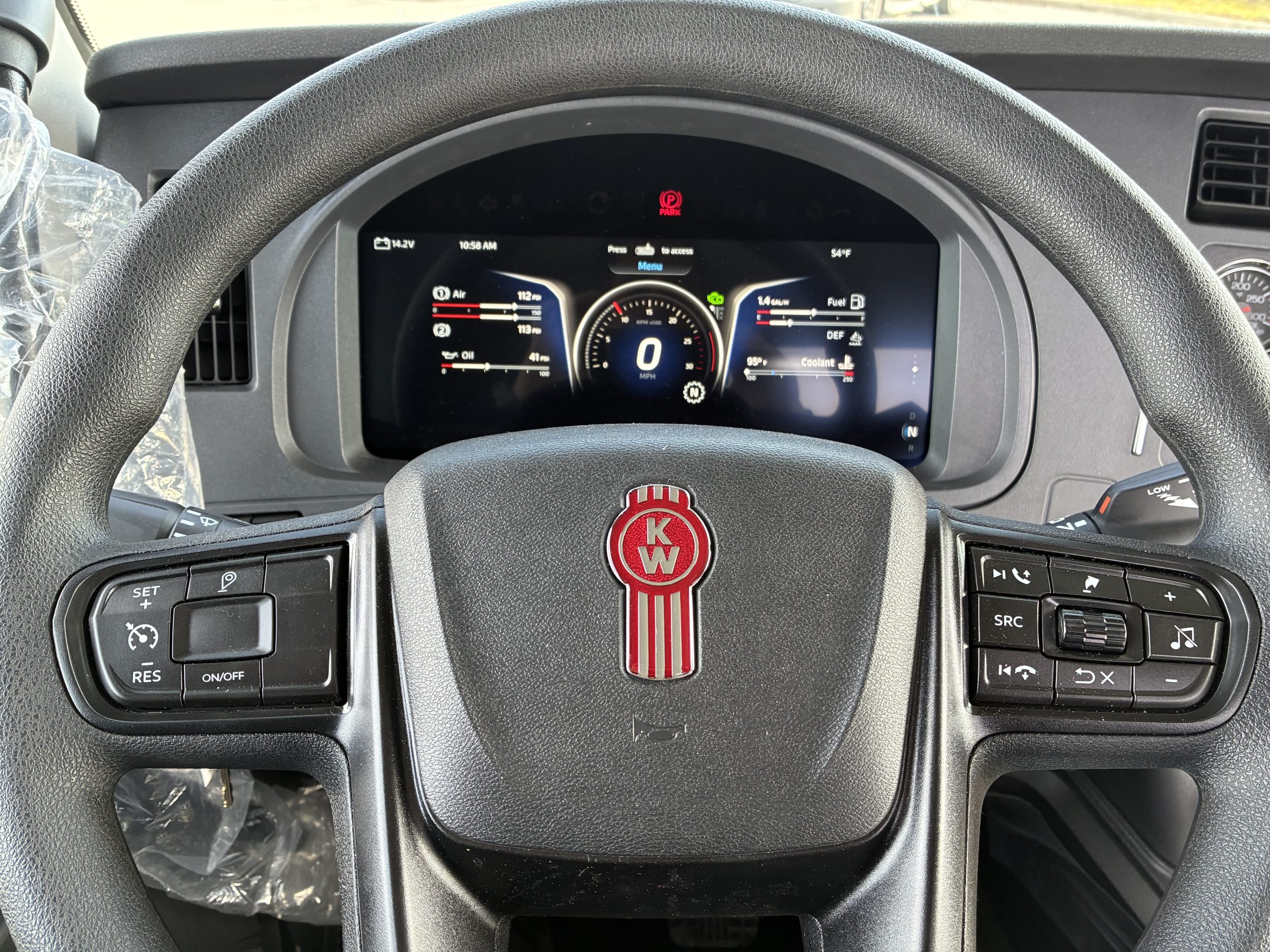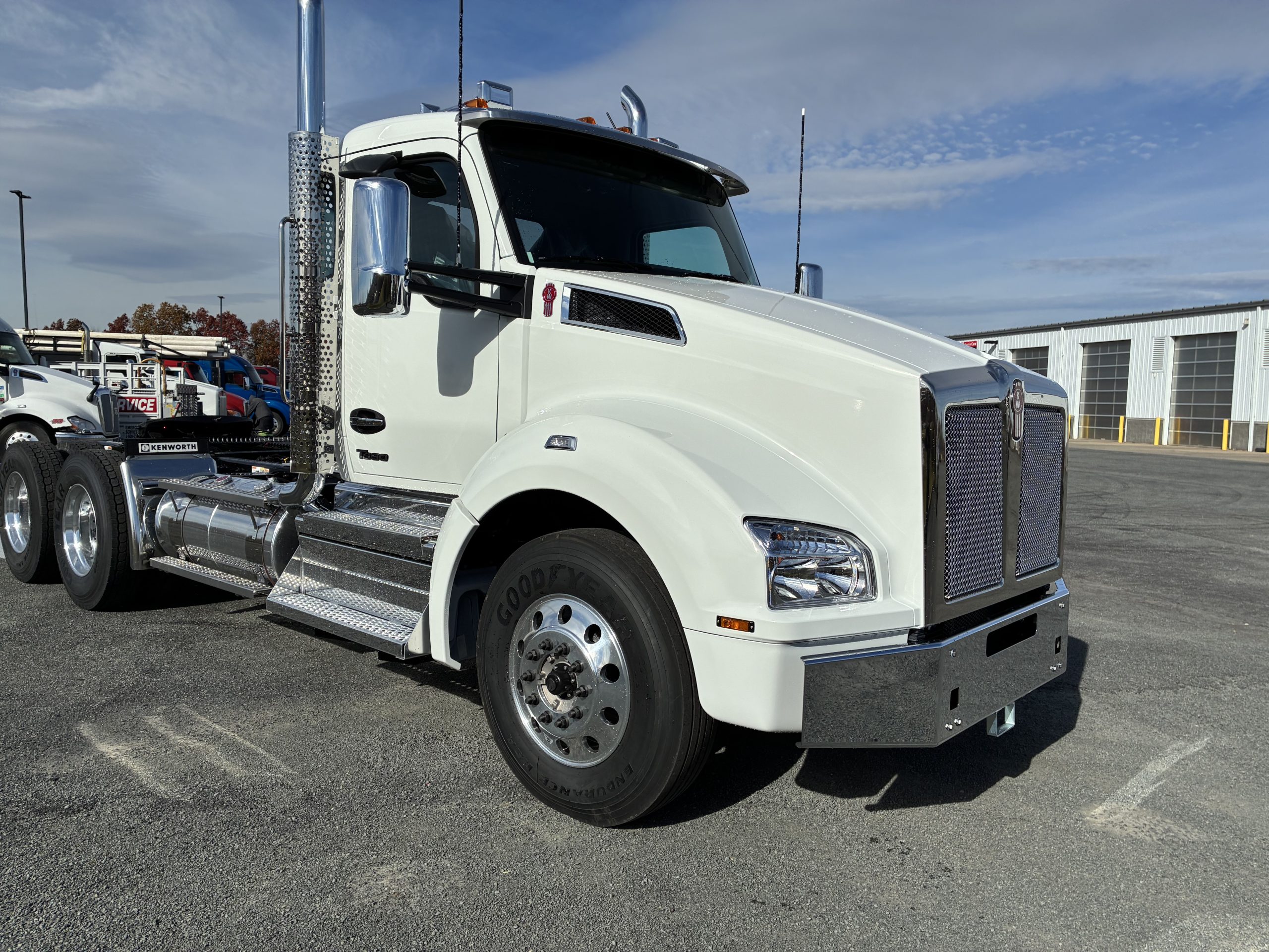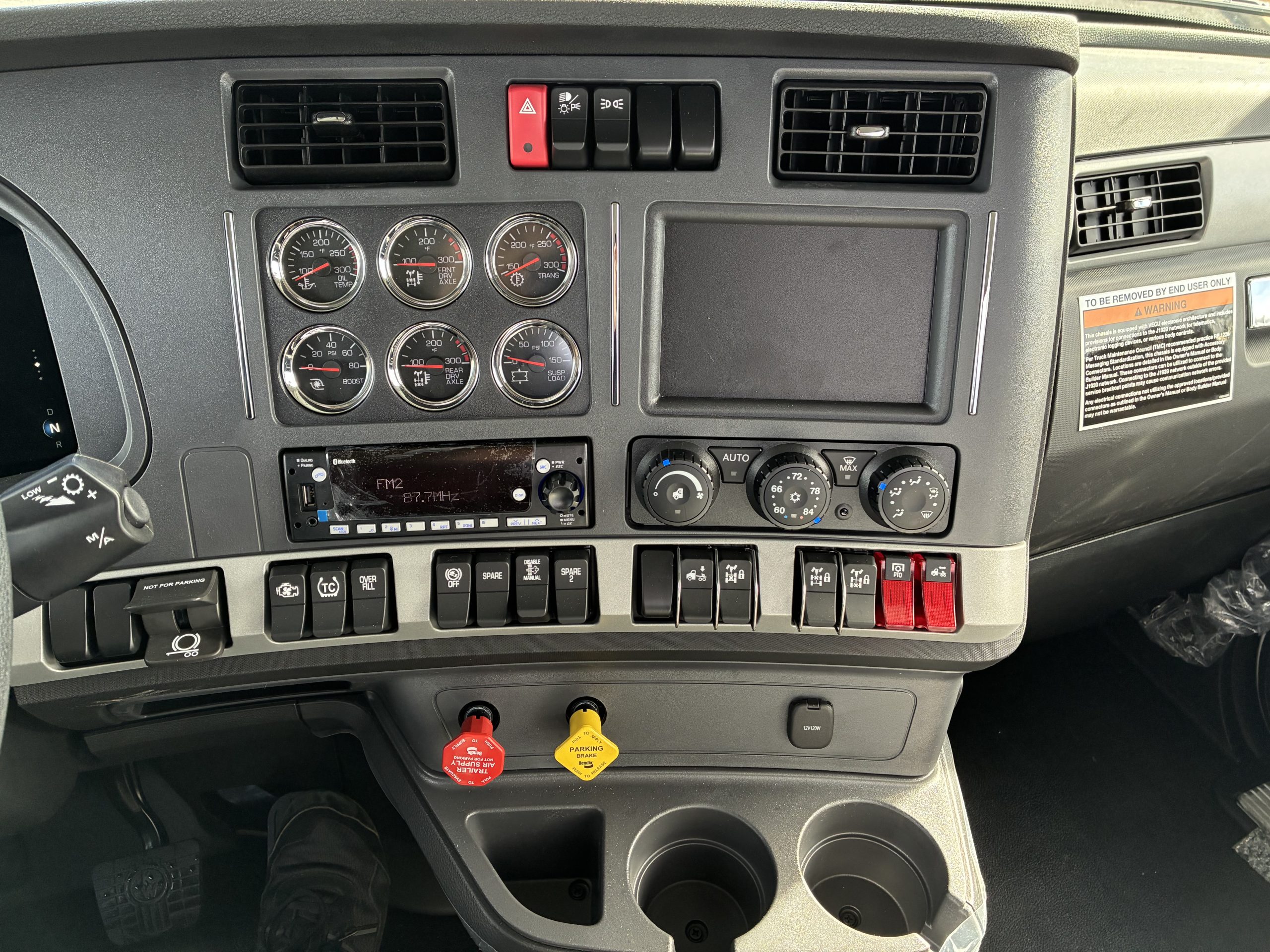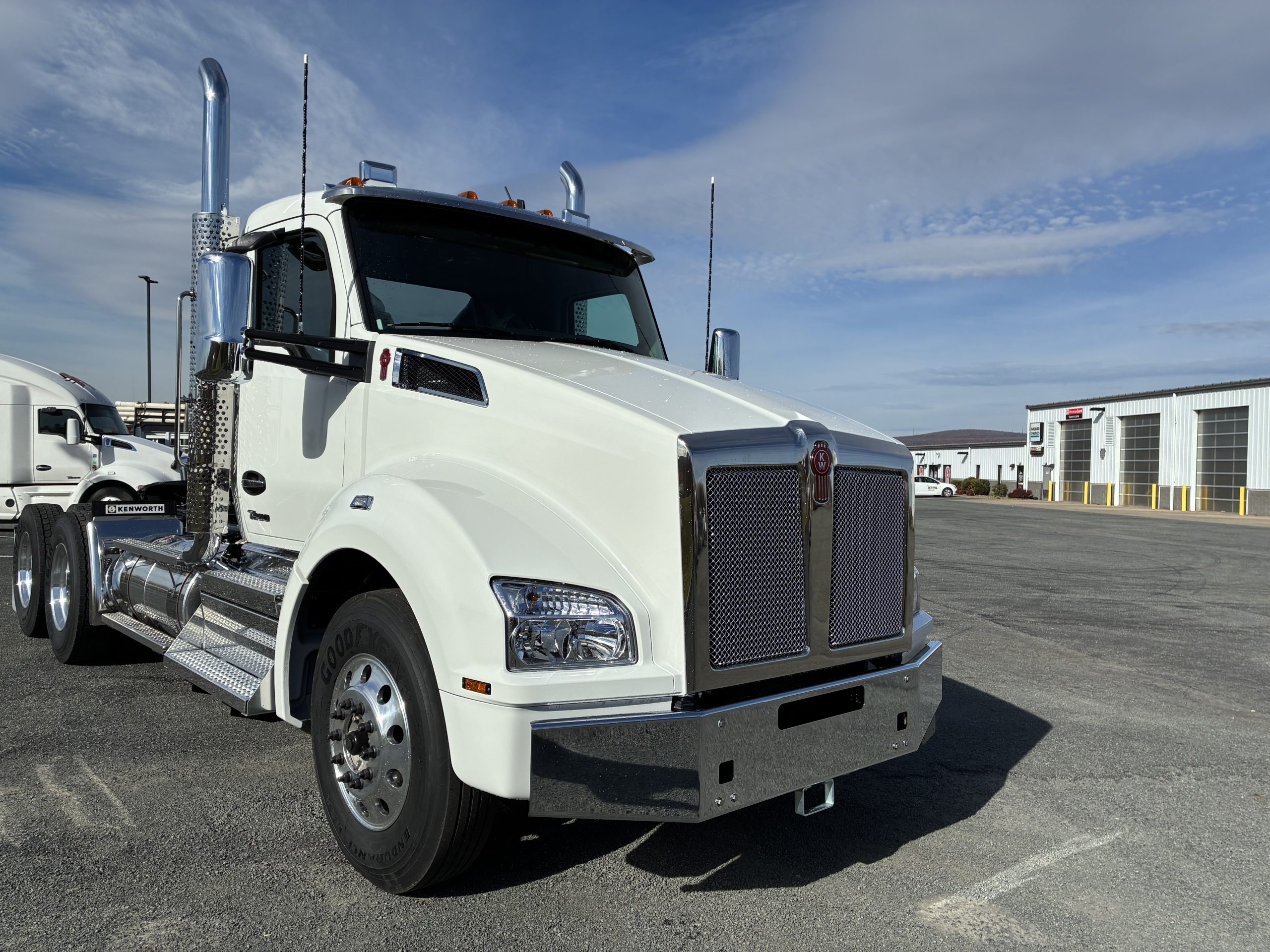 T880 HD Day Cab Tractor, Cummins X15 565 HP 1,850 Torque Engine, Eaton Endurant XD 18 Speed Automated Transmission, Dual Exhaust, Davco 382 Fuel Filter, 14,320 Front and 46K Rear Axle Ratings, Dana 46K Rears with Dual Locking Diffs and Separate Switches for Each Axle and the Power Divider, All Bendix Air Disc Brakes, 11R24.5 Tires on all Alcoa Aluminum Wheels with DuraBright Finish on Outboard Wheels, Tapered Chrome Steel Bumper, Huck Bolted Frame, Holland FW35 36″ Sliding Fifthwheel, 100 Gal Fuel and 120 Split Fuel Hydraulic Polished Tanks with Polished Stainless Steel 7″ HD Straps, 23.8 Gal DEF Tank with Polished Stainless Steel Cover, Slate Gray Vantage Interior with Black DuraCloth Driver Air Ride Driver Seat and DuraCloth Toolbox Rider Seat, KW AM/FM/WB/USB/Bluetooth Radio, CB Installation Kit, Dual 23″ Stainless Roof Mounted Air Horns, KW Aero Mirrors with Chrome Shells, Stainless Steel Exterior Sunvisor, Back Up Alarm, Zinc Phosphate Frame Rail Paint, White with Black Frame.