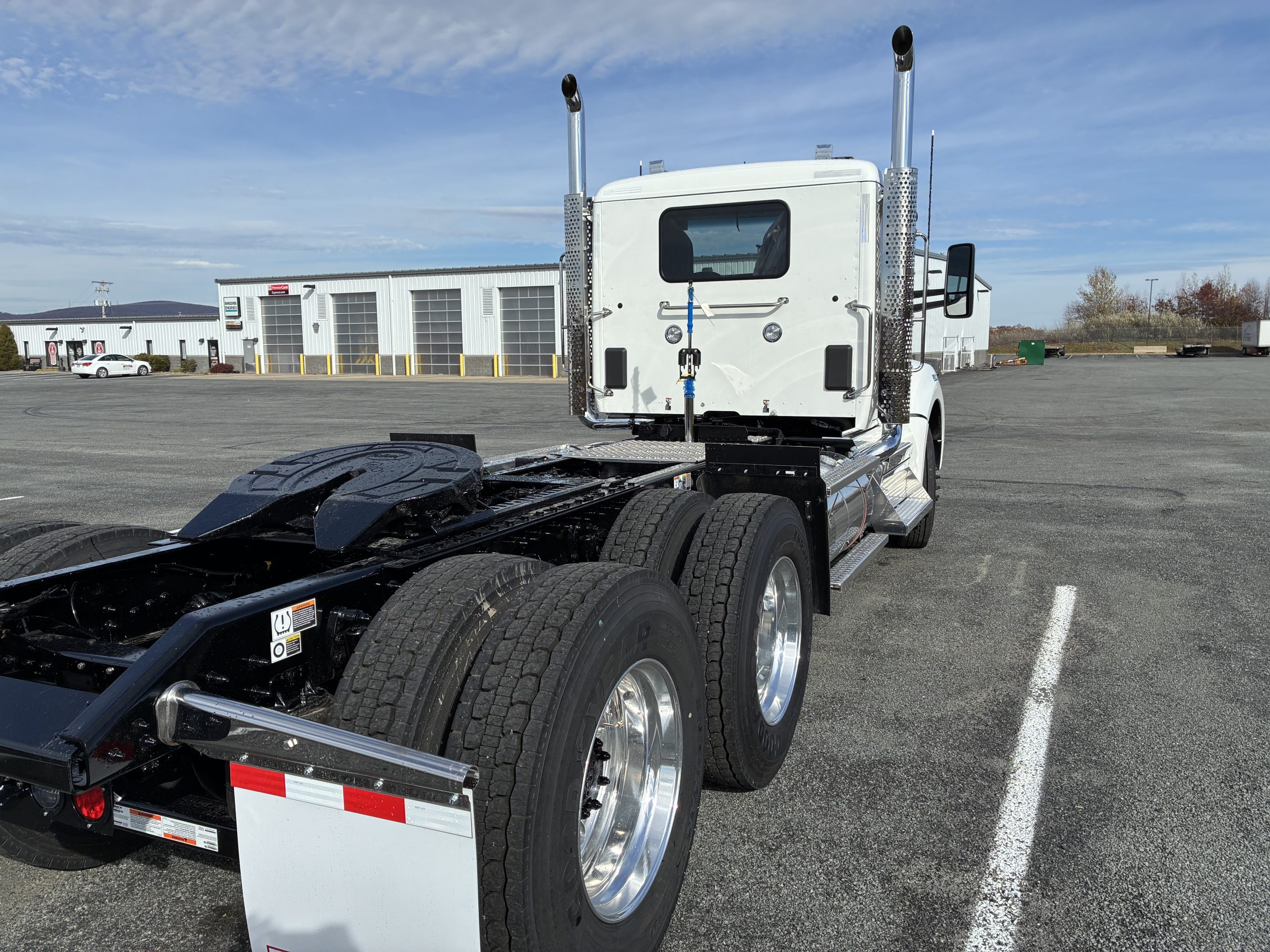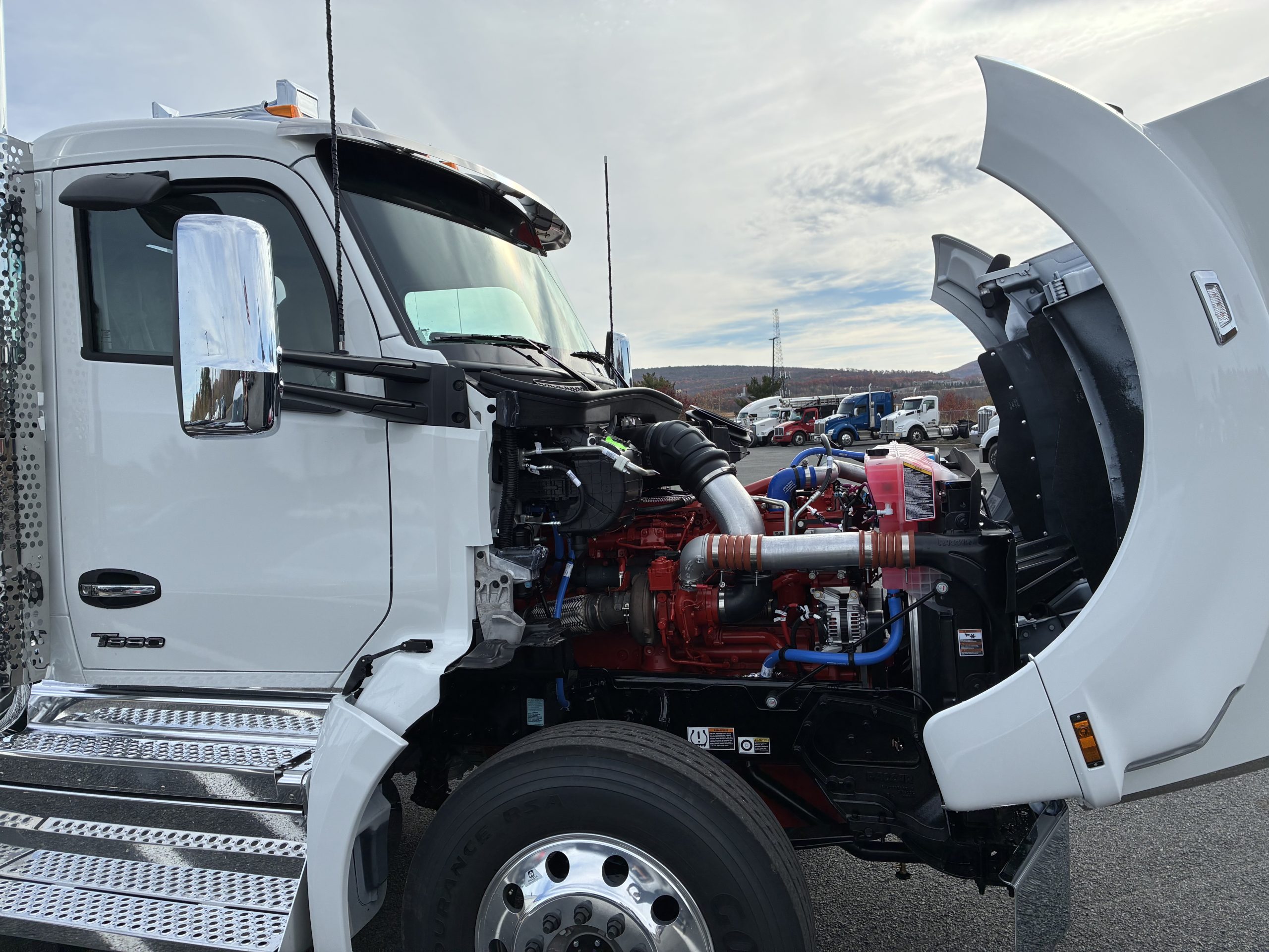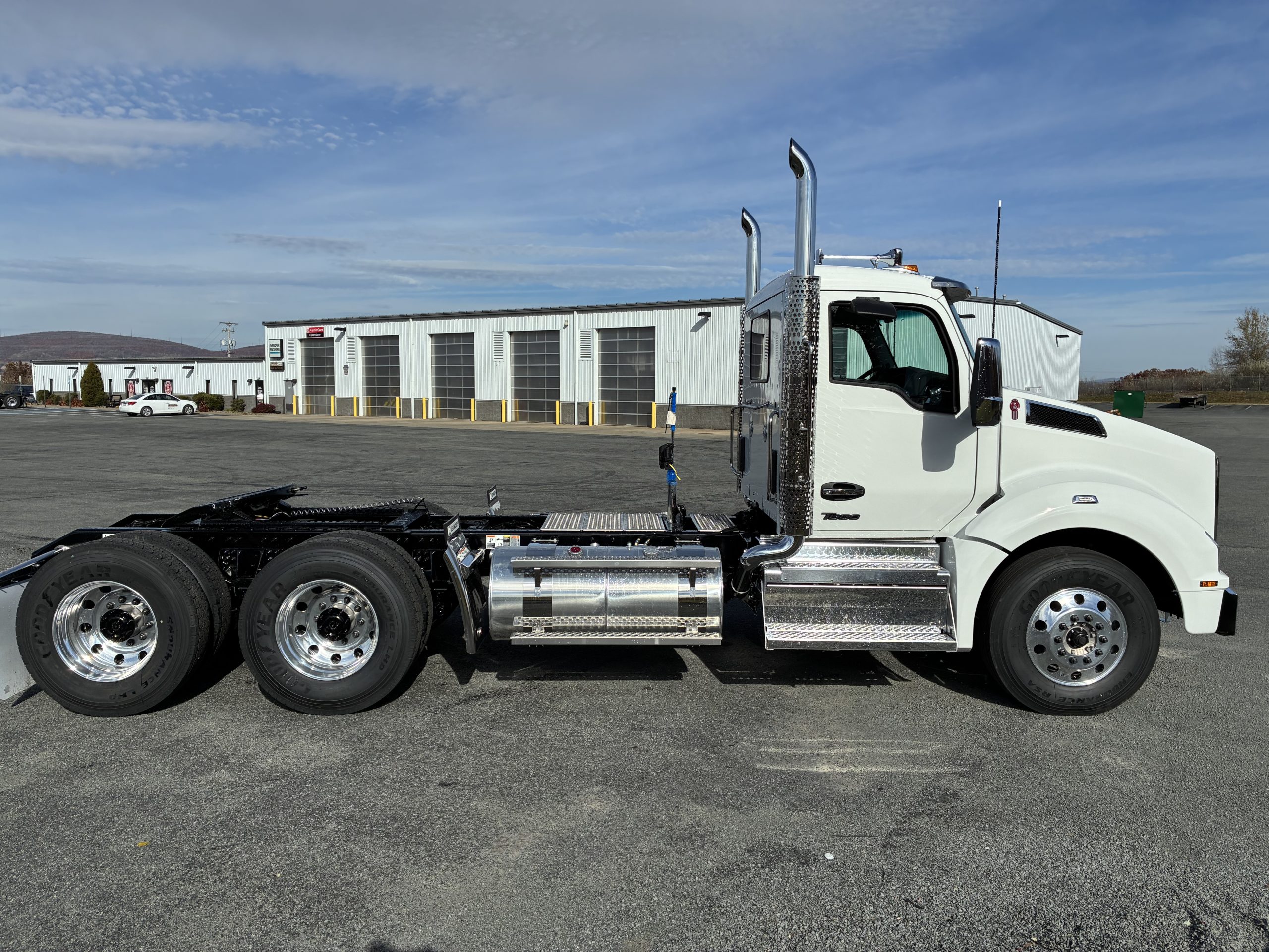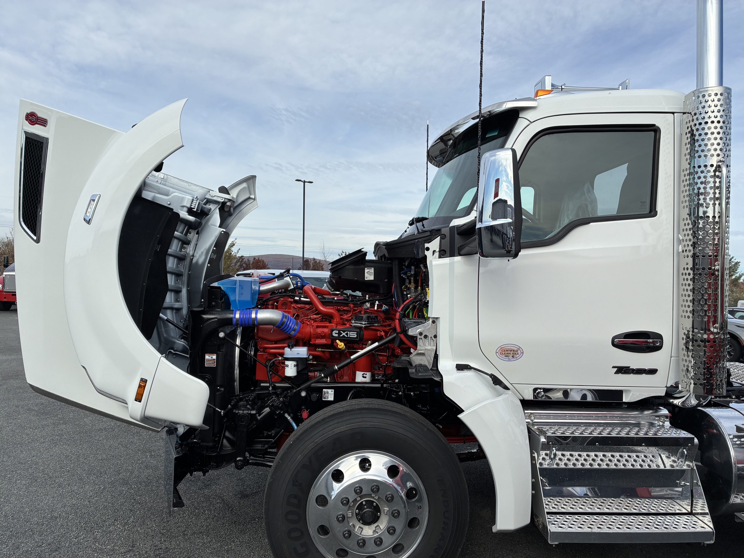 T880 HD Day Cab Tractor, Cummins X15 565 HP 1,850 Torque Engine, Eaton Endurant XD 18 Speed Automated Transmission, Dual Exhaust, Davco 382 Fuel Filter, 14,320 Front and 46K Rear Axle Ratings, Dana 46K Rears with Dual Locking Diffs and Separate Switches for Each Axle and the Power Divider, All Bendix Air Disc Brakes, 11R24.5 Tires on all Alcoa Aluminum Wheels with DuraBright Finish on Outboard Wheels, Tapered Chrome Steel Bumper, Huck Bolted Frame, Holland FW35 36″ Sliding Fifthwheel, 100 Gal Fuel and 120 Split Fuel Hydraulic Polished Tanks with Polished Stainless Steel 7″ HD Straps, 23.8 Gal DEF Tank with Polished Stainless Steel Cover, Slate Gray Vantage Interior with Black DuraCloth Driver Air Ride Driver Seat and DuraCloth Toolbox Rider Seat, KW AM/FM/WB/USB/Bluetooth Radio, CB Installation Kit, Dual 23″ Stainless Roof Mounted Air Horns, KW Aero Mirrors with Chrome Shells, Stainless Steel Exterior Sunvisor, Back Up Alarm, Zinc Phosphate Frame Rail Paint, White with Black Frame.