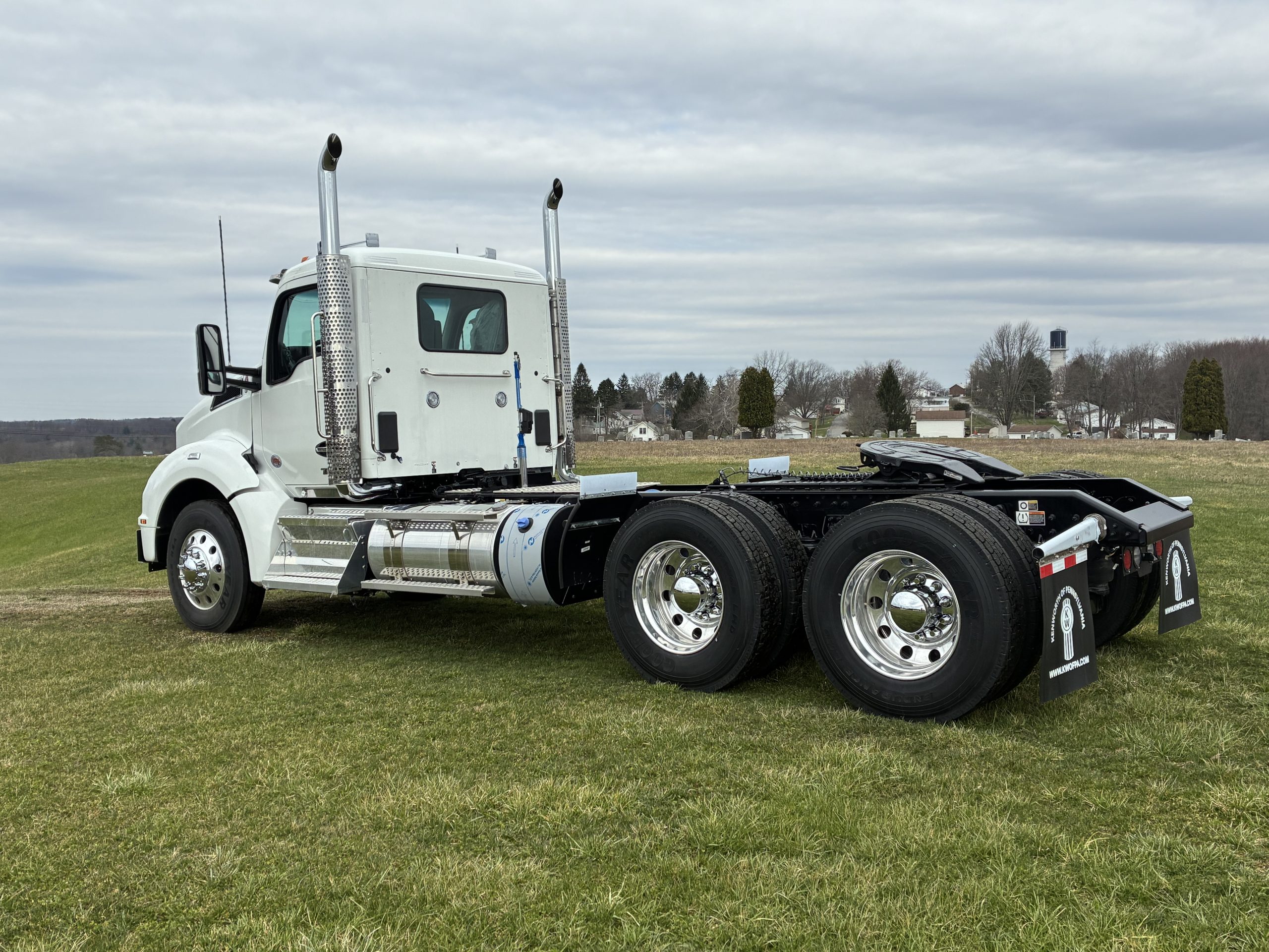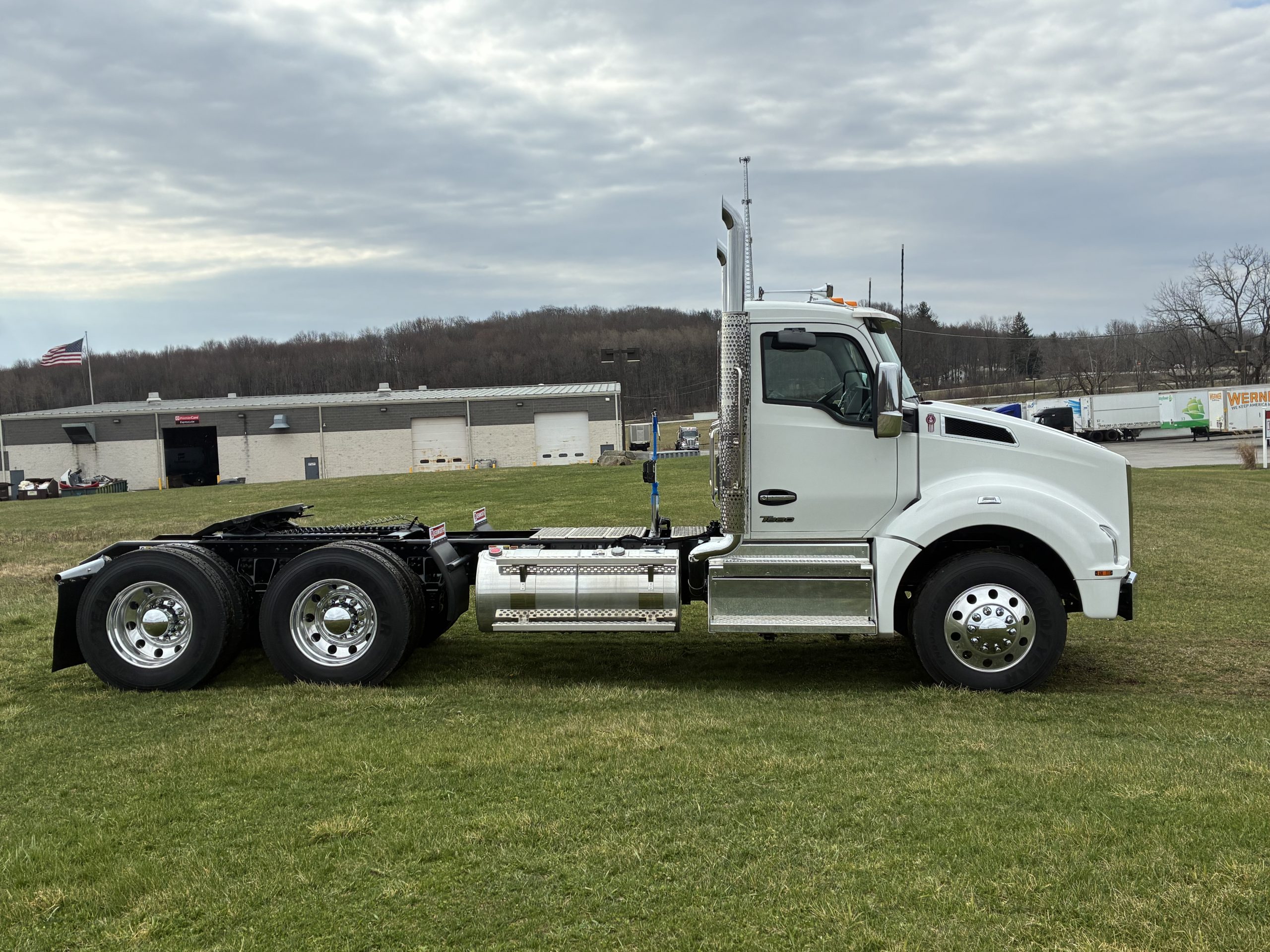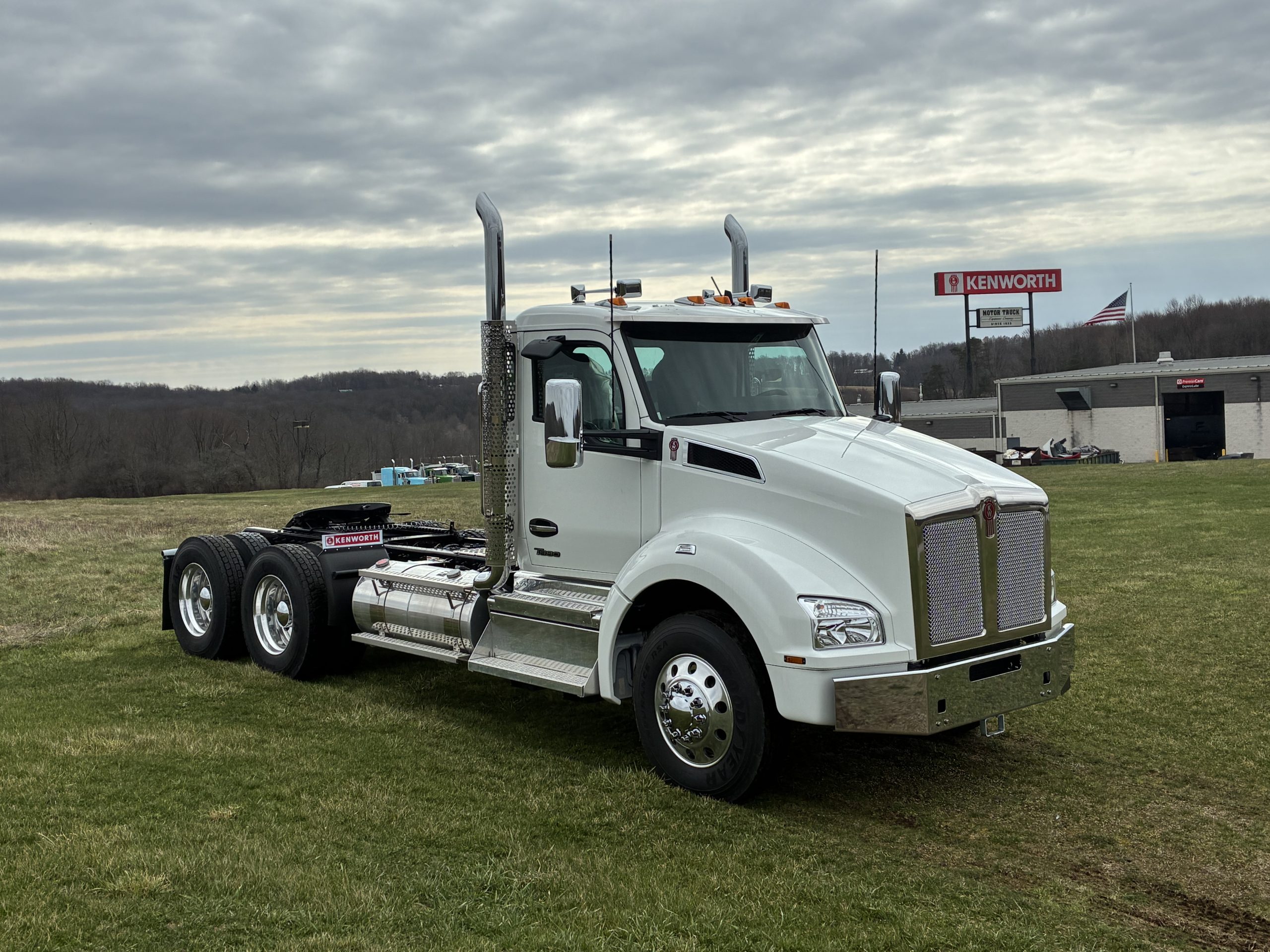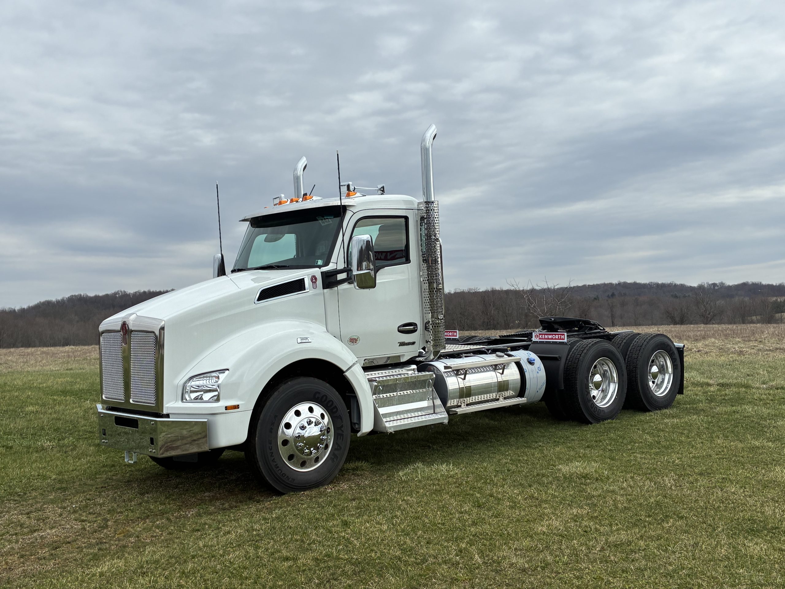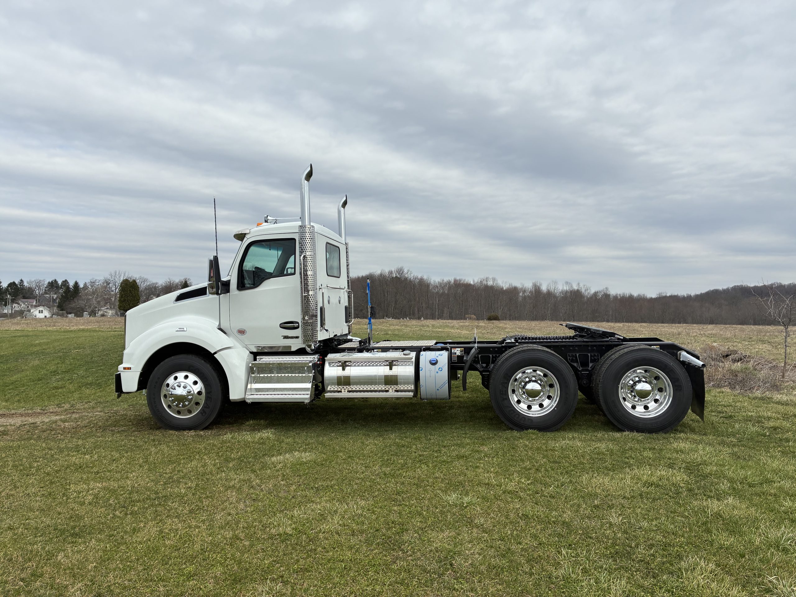 2027 Model Year T880 Heavy Day Cab Tractor, Cummins X15 565 HP 1850 Torque, Eaton RTLO20918B 18 Speed Manual, 14,6K Steer, 46K Rears with dual lockers and separate switches for each axle and power divider, 11R24.5 Tires on Alcoa Aluminum Wheels with Durabright finish outboard sides. Dual Exhaust, Davco 382 Fuel Filter, Bendix Air Disc Brakes, Holland 36″ FW35 Sliding Fifthwheel, 100 Gallon Fuel Tank & 14 Gallon DEF Tank LH Side, 120 Gallon Split Fuel & Hydraulic Tank RH Side, Black Air Ride Driver Seat and Fixed Tool Box Rider Seat, KW AM/FM/WB/USB Bluetooth Radio, CB Installation Kit, Stainless Steel Exterior Sunvisor, KW Aero Mirrors with Chrome Shells, White Cab with Black Frame.