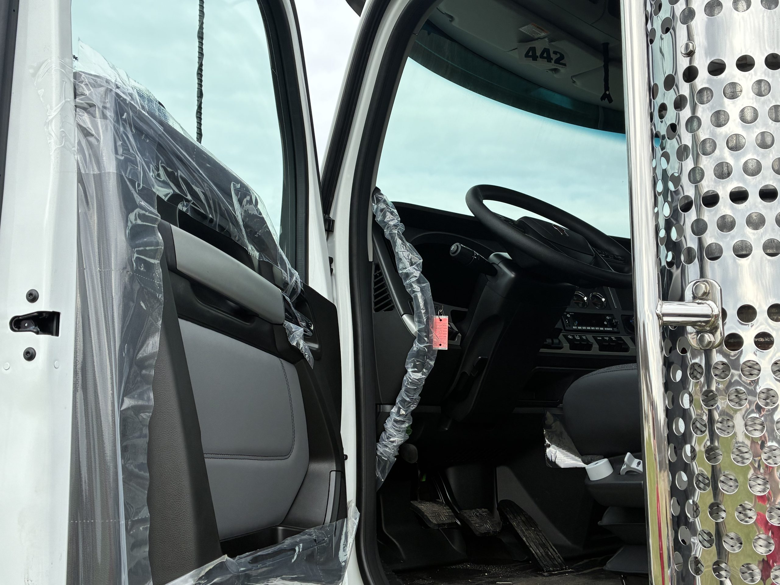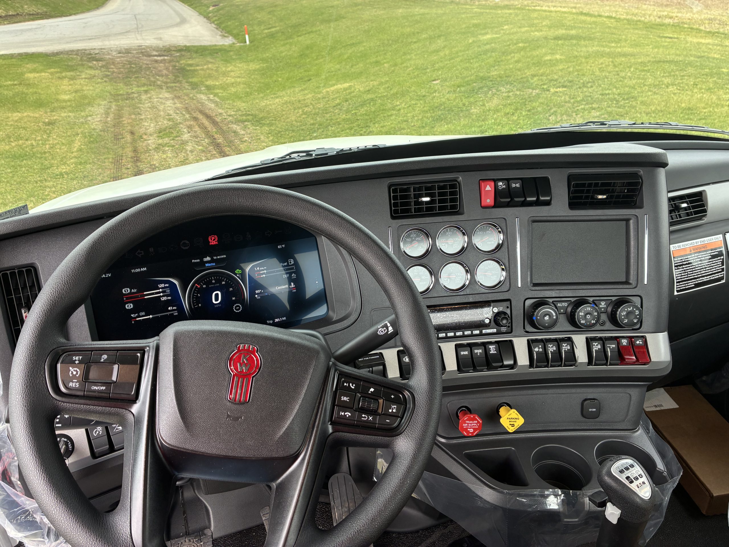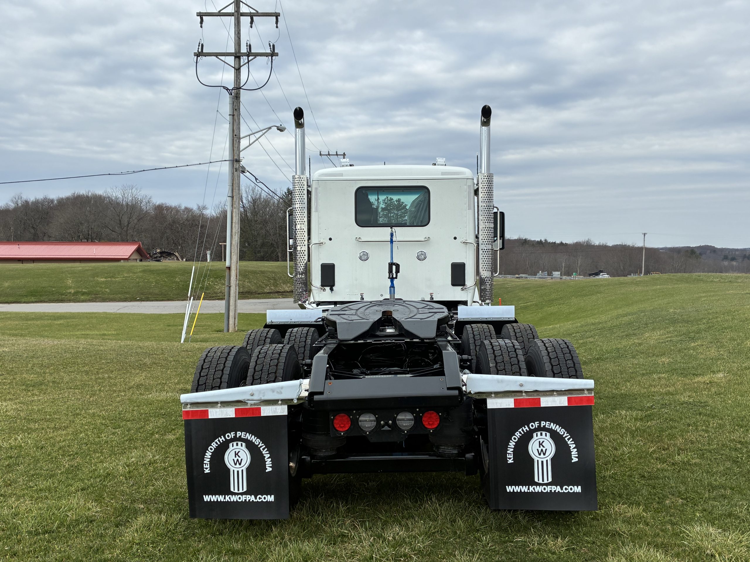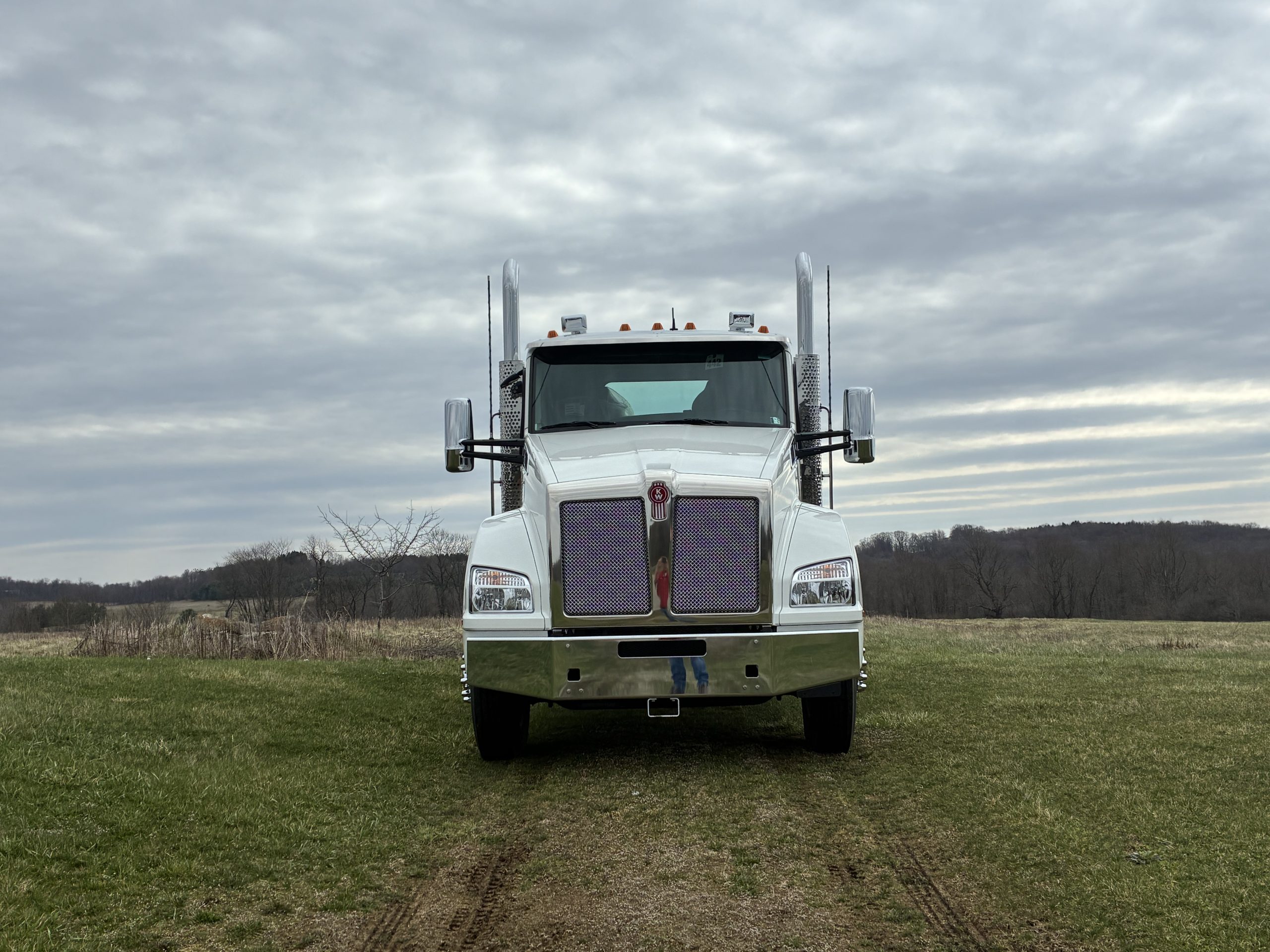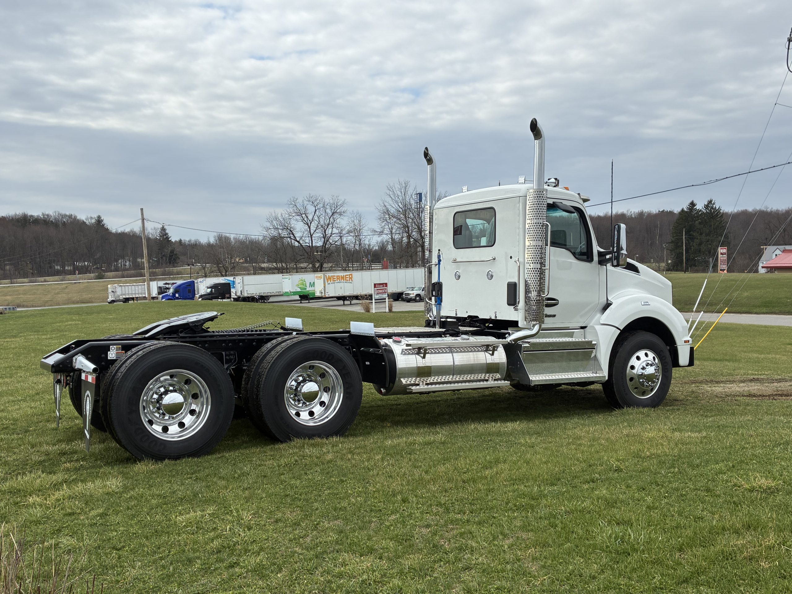 2027 Model Year T880 Heavy Day Cab Tractor, Cummins X15 565 HP 1850 Torque, Eaton RTLO20918B 18 Speed Manual, 14,6K Steer, 46K Rears with dual lockers and separate switches for each axle and power divider, 11R24.5 Tires on Alcoa Aluminum Wheels with Durabright finish outboard sides. Dual Exhaust, Davco 382 Fuel Filter, Bendix Air Disc Brakes, Holland 36″ FW35 Sliding Fifthwheel, 100 Gallon Fuel Tank & 14 Gallon DEF Tank LH Side, 120 Gallon Split Fuel & Hydraulic Tank RH Side, Black Air Ride Driver Seat and Fixed Tool Box Rider Seat, KW AM/FM/WB/USB Bluetooth Radio, CB Installation Kit, Stainless Steel Exterior Sunvisor, KW Aero Mirrors with Chrome Shells, White Cab with Black Frame.