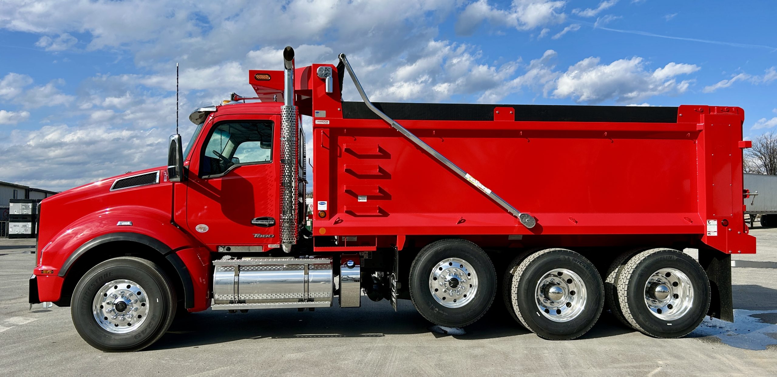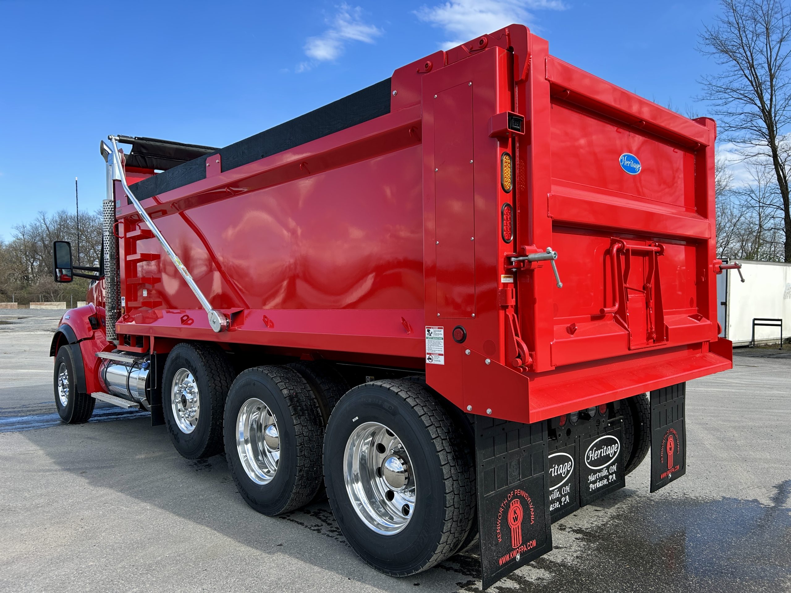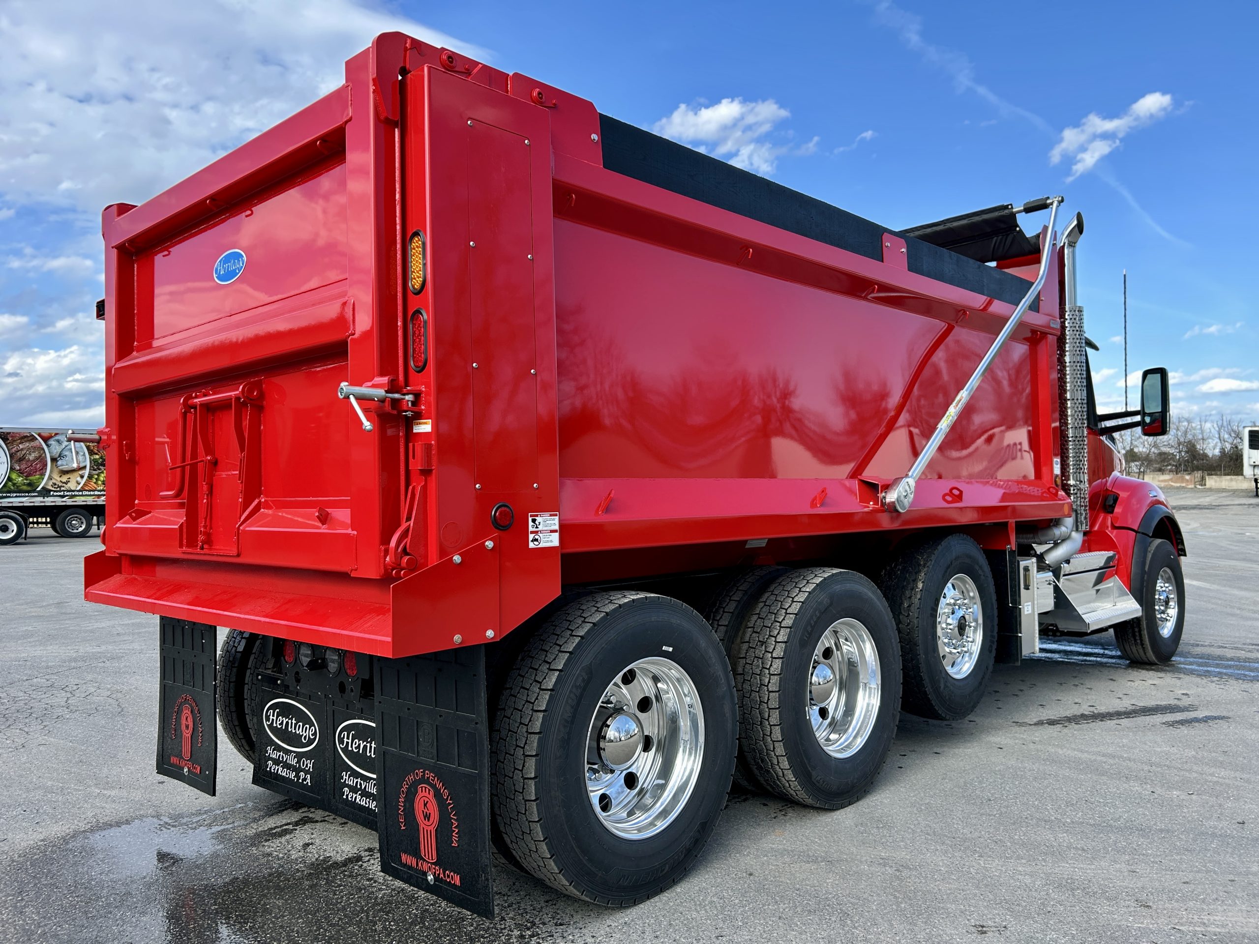 This Tri Axle Dump with get the job done with its Viper Red color. Vehicle Specs: Body: Heritage Body with Aero Electric Tarpar Engine: Paccar MX13 510 HP 1850 Torque Engine Transmission: Allison 4500RDS Transmission Mileage: 0 Features and Equipment: 46K Rears with Lockers and separate switches for each axle 110 Gallon Fuel Tank and 14 Gallon DEF Tank Air Ride Driver Seat and Toolbox Rider Seat KW Aero Mirrors with Chrome Shells Stainless Steel Exterior Sunvisor High Lift Tailgate Rear Vision Camera installed in rear body post